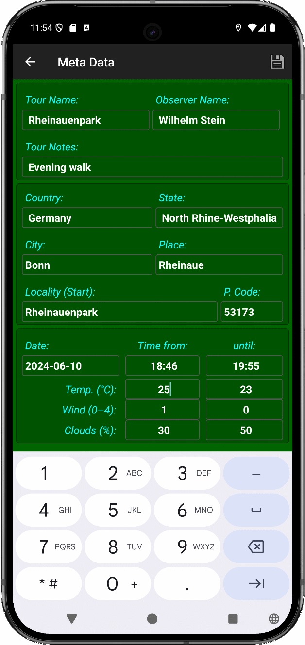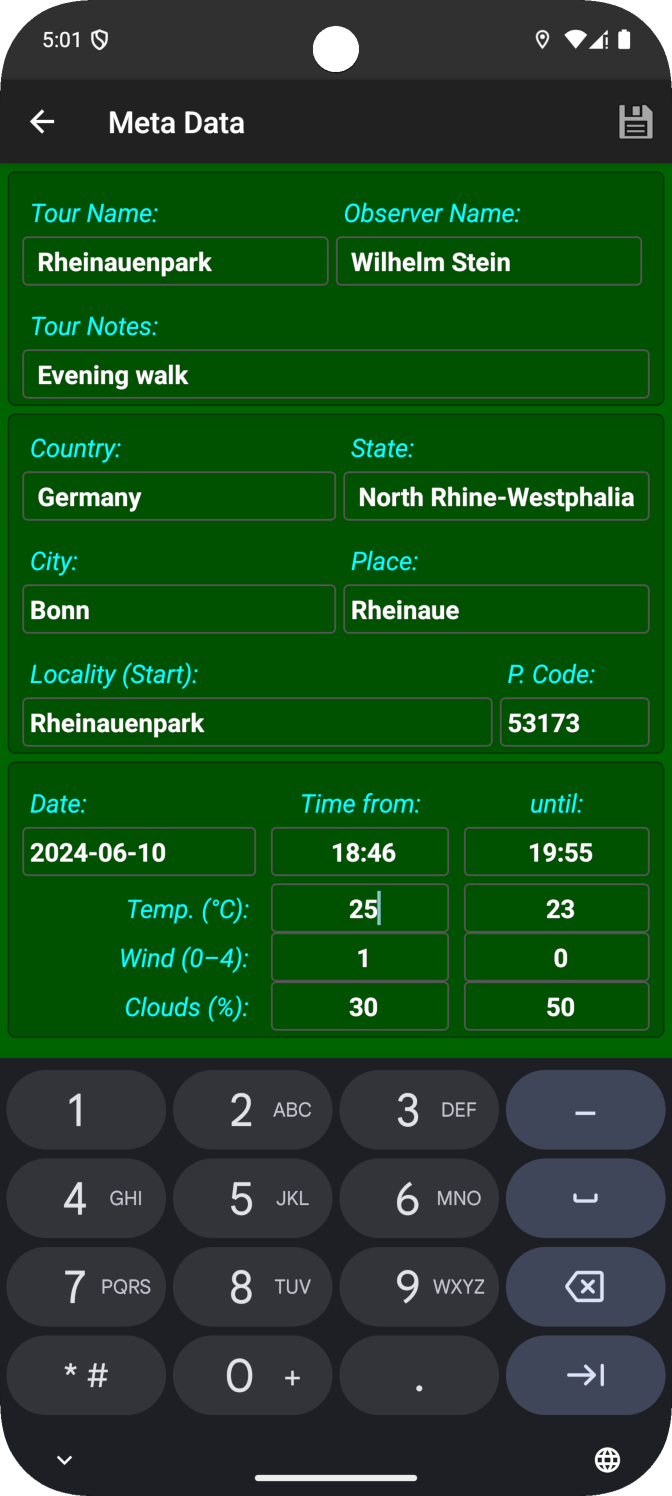 - The app automatically inserts date, time, coordinates and height as well as location data by reverse OSM-geocoding provided that GPS and internet are accessible.