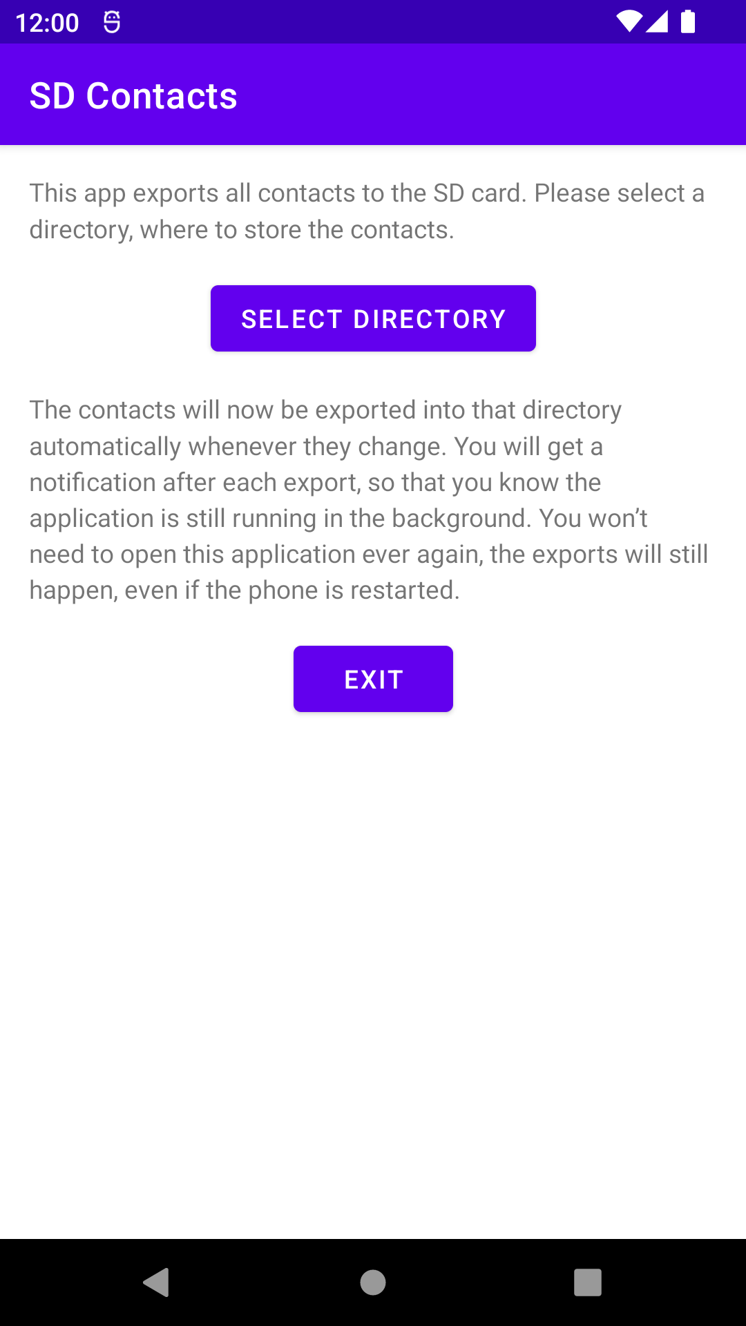 This app is meant for users that don't want to synchronize their contacts online, but want to keep them local to the phone. Though there is a problem, if you brick your phone, you might lose all your contacts. With this app, you will have a backup of your contacts stored on the SD card. You can take it out and import the contacts into your new phone.