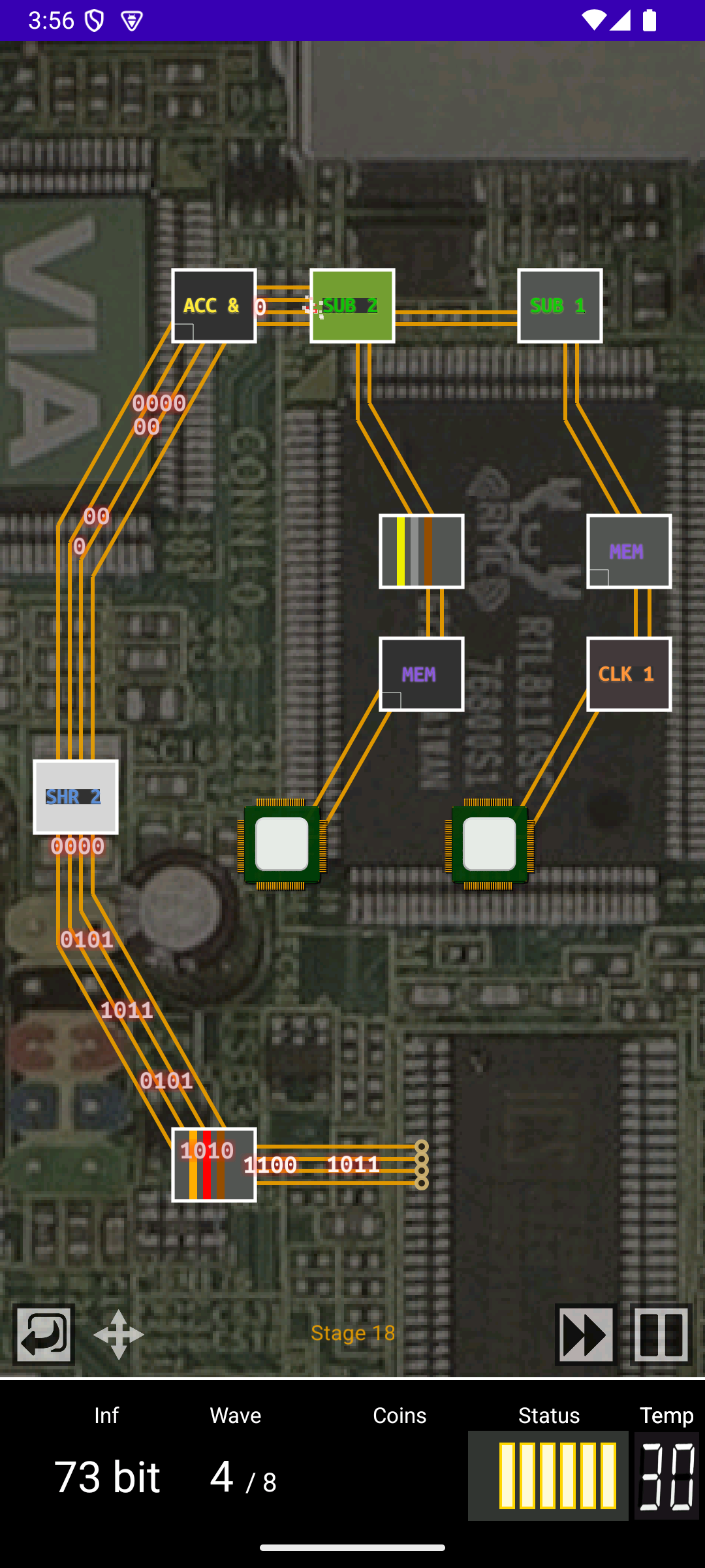 The attackers in this game are represented as bits and bytes. To defend the cpu against them, the player builds chips in designated slots. These "towers" deal damage by operations such as subtraction, right shift, bitwise and, etc. As usual in these games, the chips can be upgraded in strength.