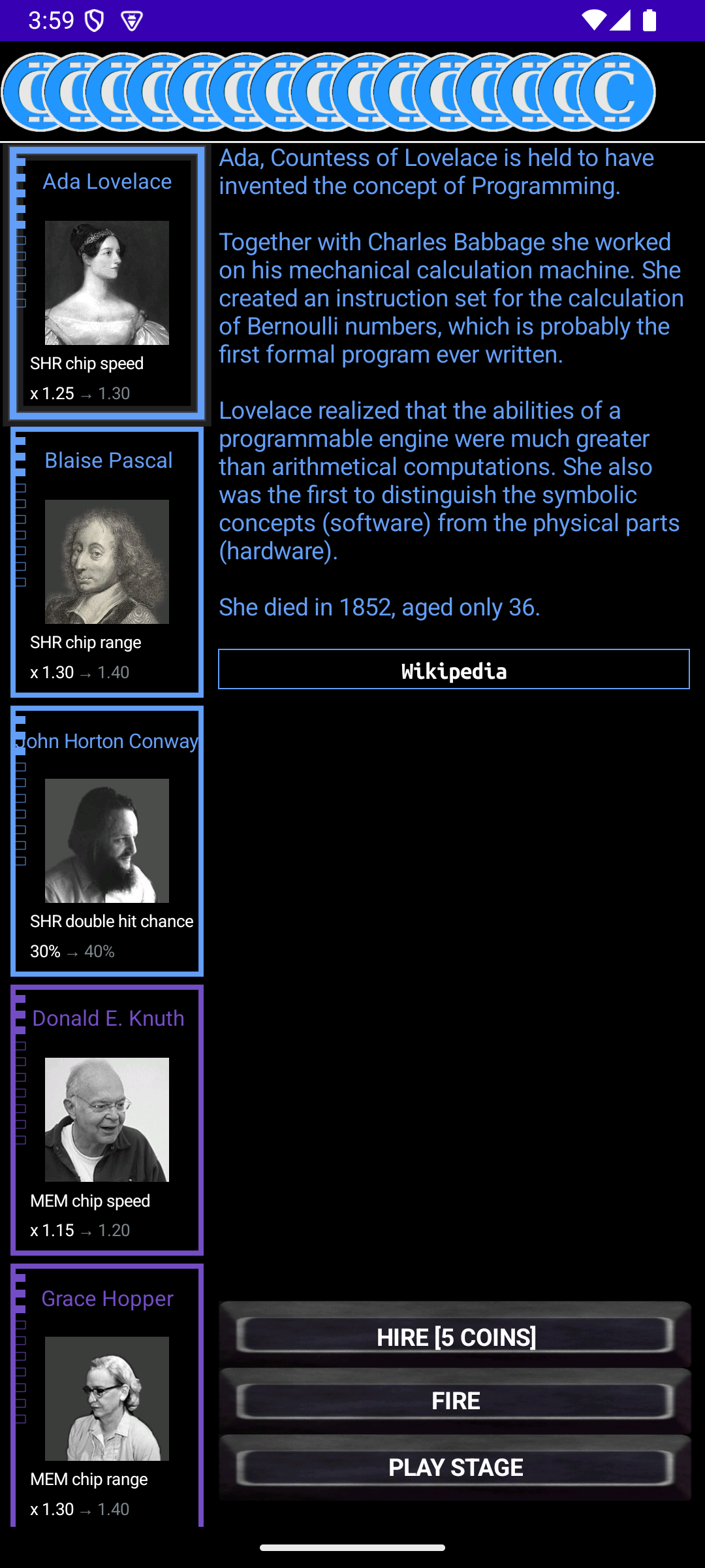 The game features "heroes of the information age": persons that had great influence on the development of modern computers. They come with a short biography und provide global bonuses that make the game considerably easier.