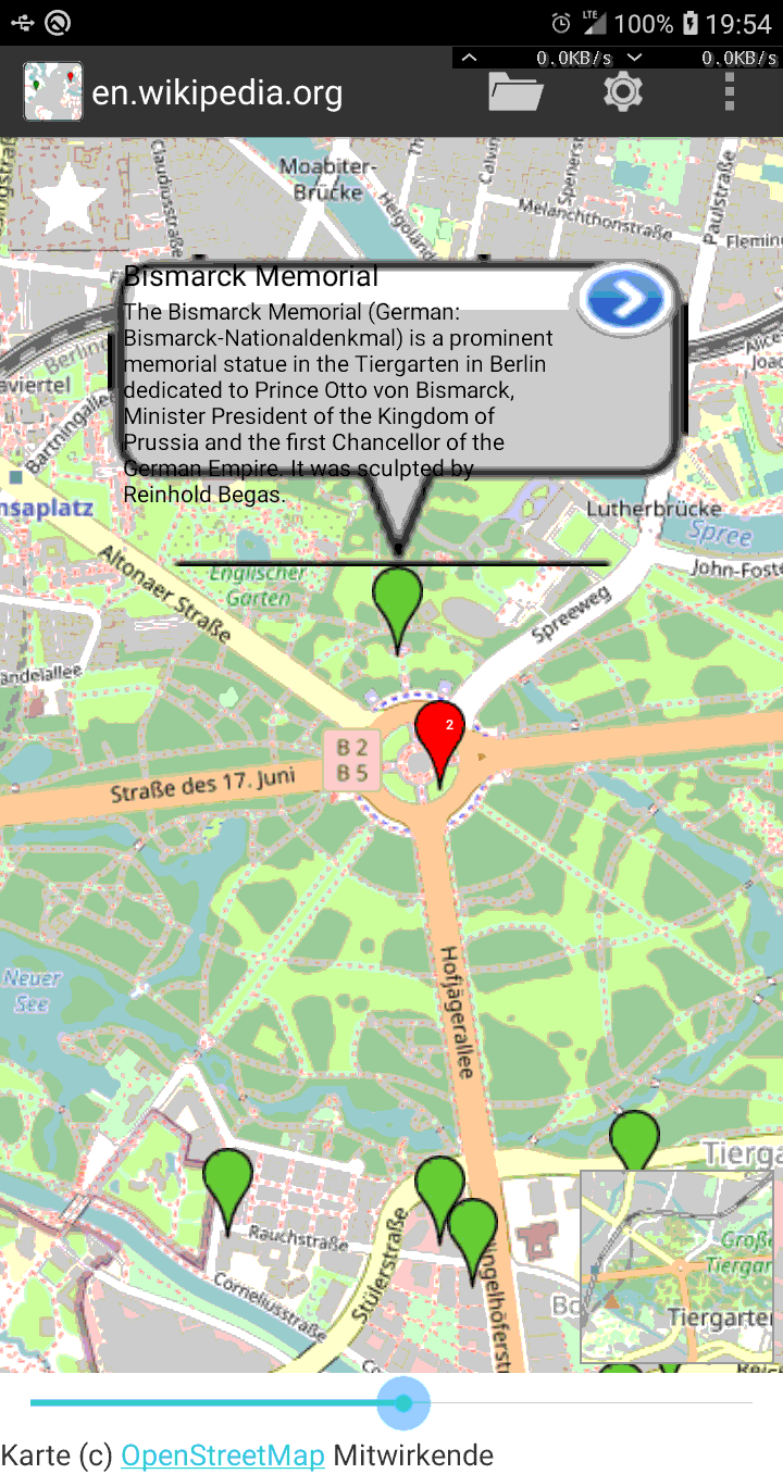 Location Map Viewer shows a map with bubbles (or article-icons if enabled/available) for every wikipedia article found.