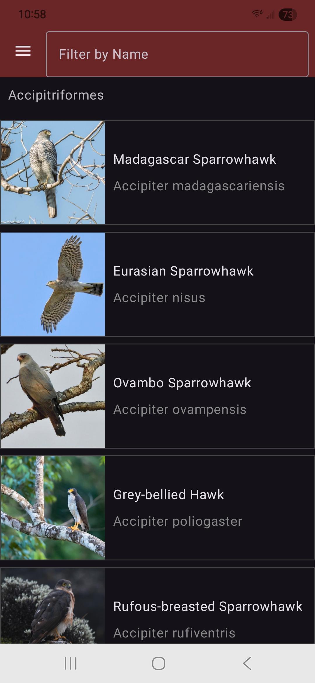 The birds are presented in alphabetical order by taxon and scientific name. Scroll to view more birds, or filter by name in the filter bar. Click on a bird to view more information about it on eBird. Navigate to settings to change the theme, toggle the display of IUCN Red List markers, or change the region to show birds for.