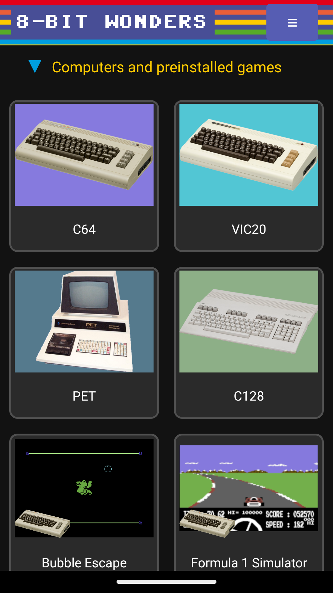 The C64, the most popular computer of the 80s, its predecessor VIC20, the PET series from 1977 onward and Commodore's last 8 bit computer C128 are supported.