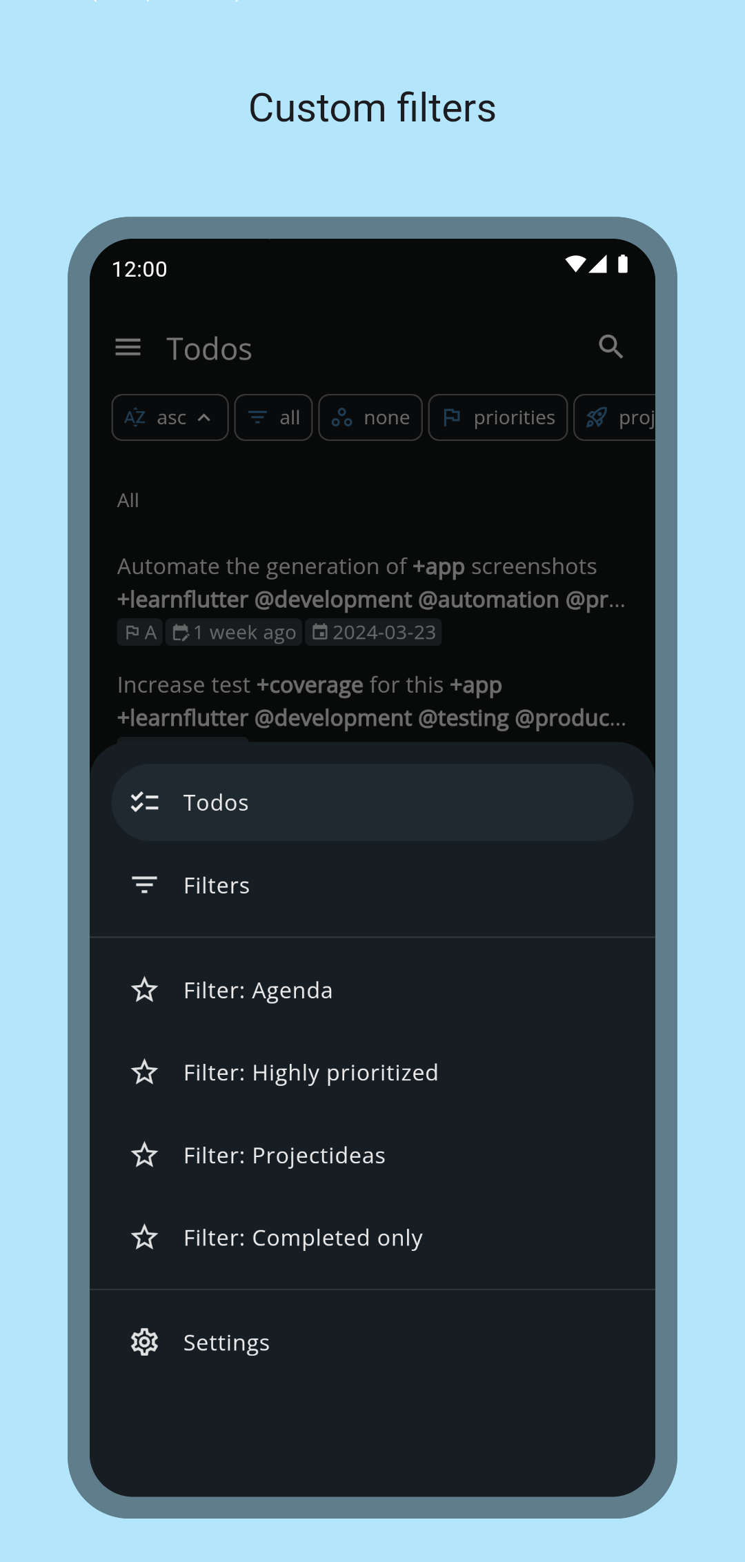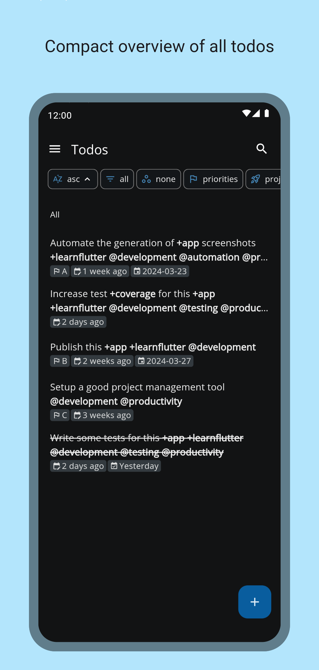 With ntodotxt you can manage your todos in a todo.txt file (i.e. all information is stored in a single file). You can save your todos locally on your device and/or synchronize the todo.txt file via webdav - for example with a self-hosted nextcloud instance.