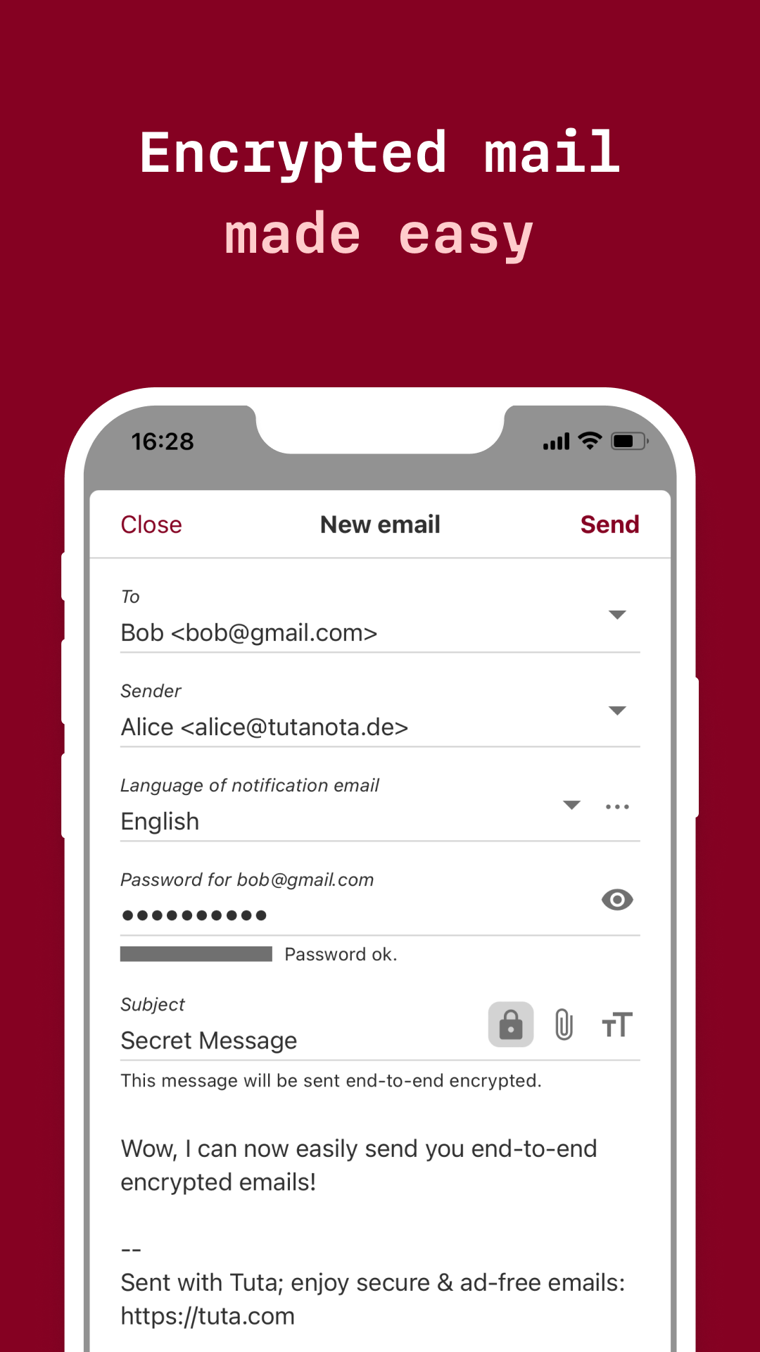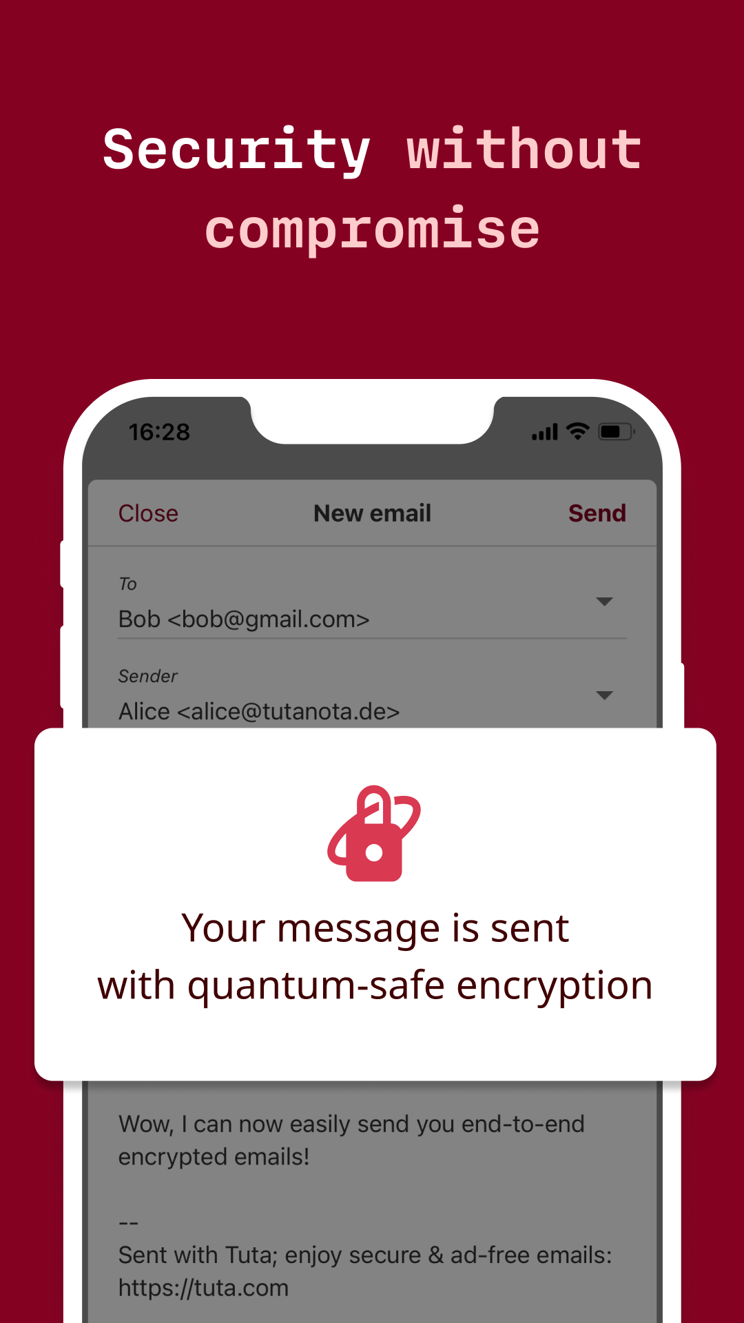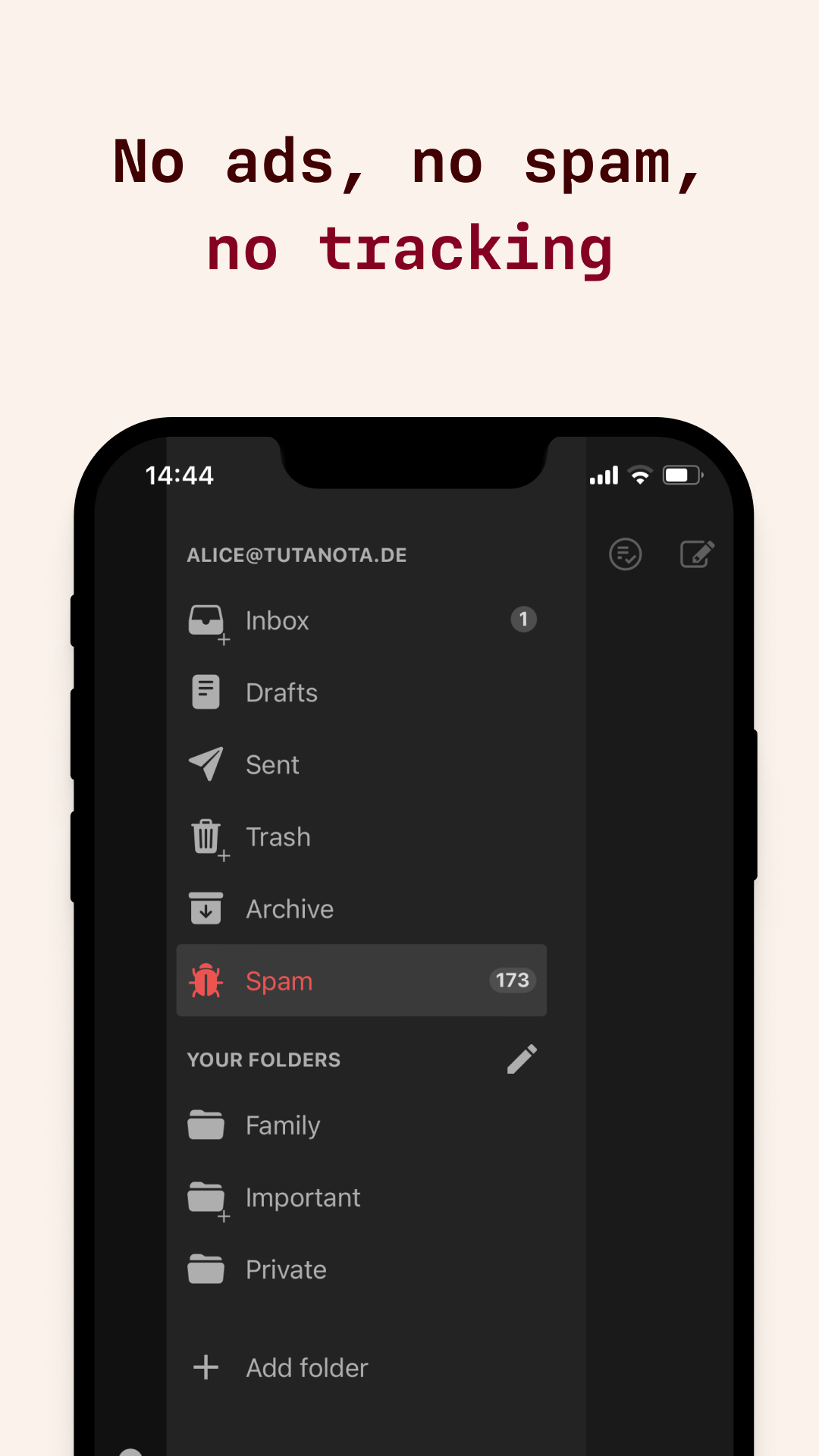 Tutanota enables you to use the benefits of the cloud - availability, flexibility, automatic back-up - without compromising on security. With Tutanota's built-in encryption you own your data, no one else can access it. Tutanota comes with a light & beautiful GUI, dark theme included, with instant push notifications, auto-sync, full-text search, swipe gestures and more.
