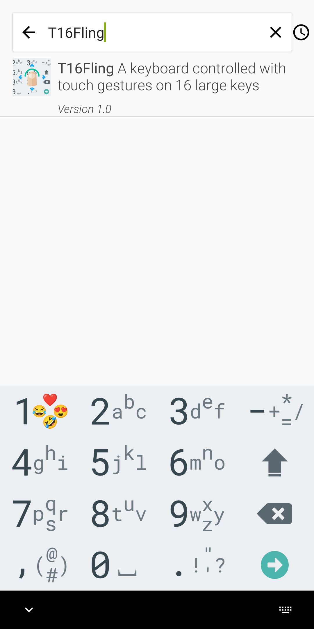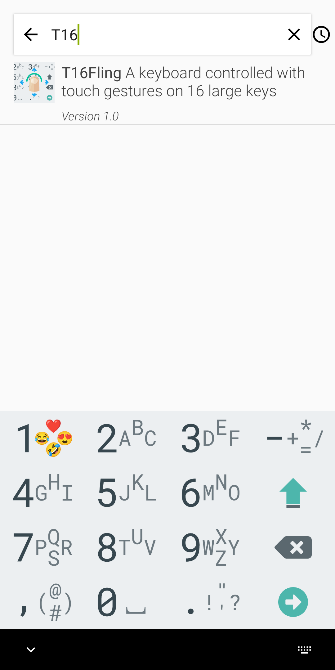 T16Fling is an Android keyboard with 16 keys in a 4x4 grid (similar to the AOSP numeric keypad) that works by flinging each key in the direction of the desired character.