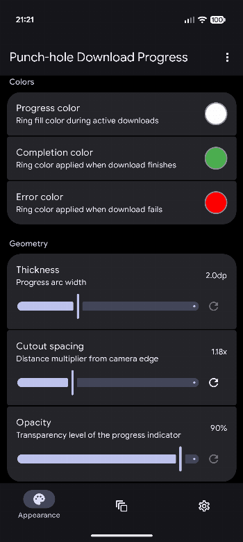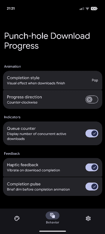 System download notifications are intercepted and visualized with customizable colors, animations, and haptic feedback. Features include an active download counter and battery saver-aware rendering.