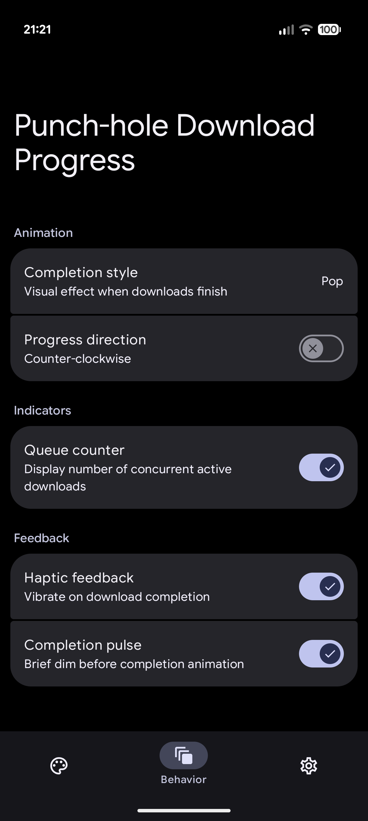 System download notifications are intercepted and visualized with customizable colors, animations, and haptic feedback. Features include an active download counter, battery saver-aware rendering, per-rotation (0°/90°/180°/270°) calibration for text and badge offsets, and optional vertical filename text in landscape.
