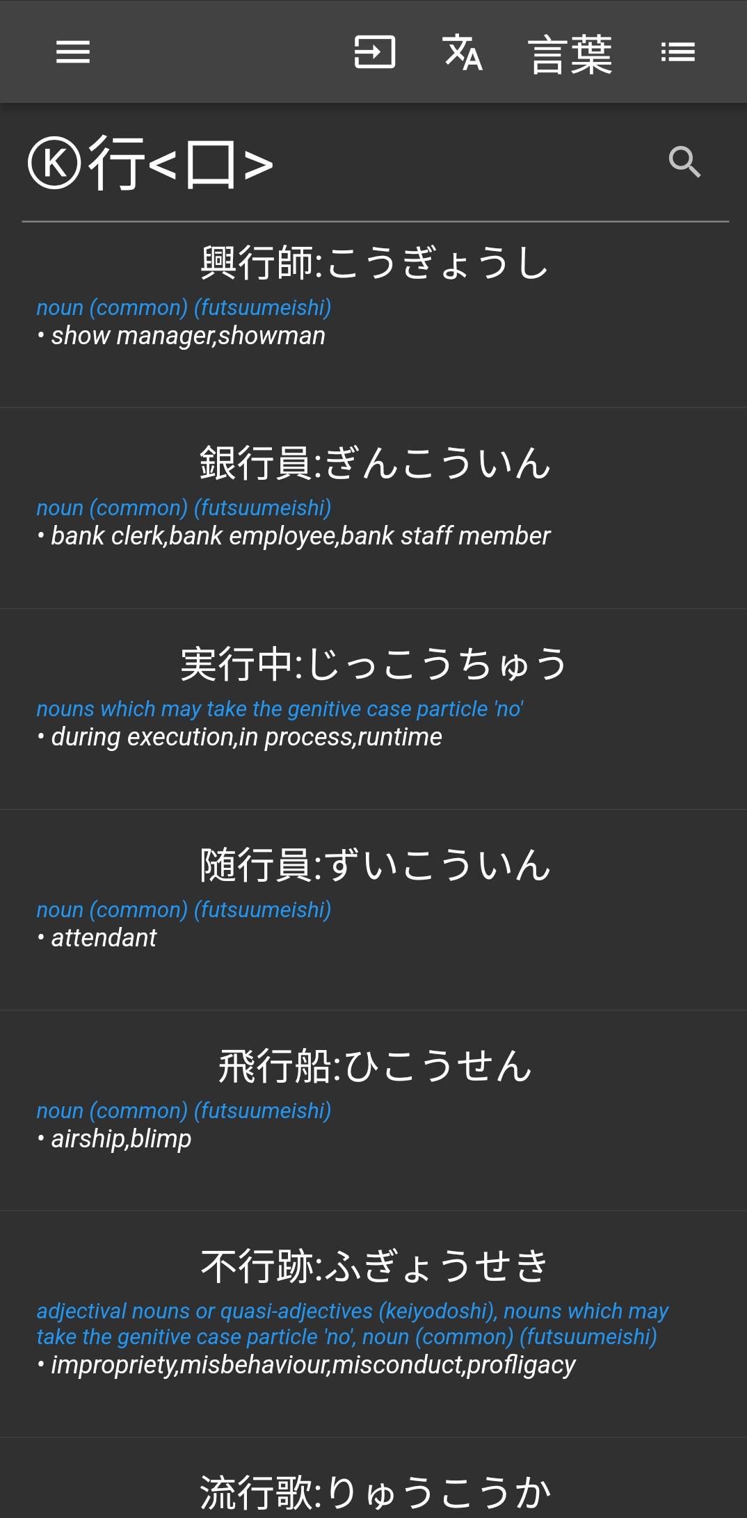 Kotoba / Kanji searchWhen Kotoba is selected, fujiten will search for expression.