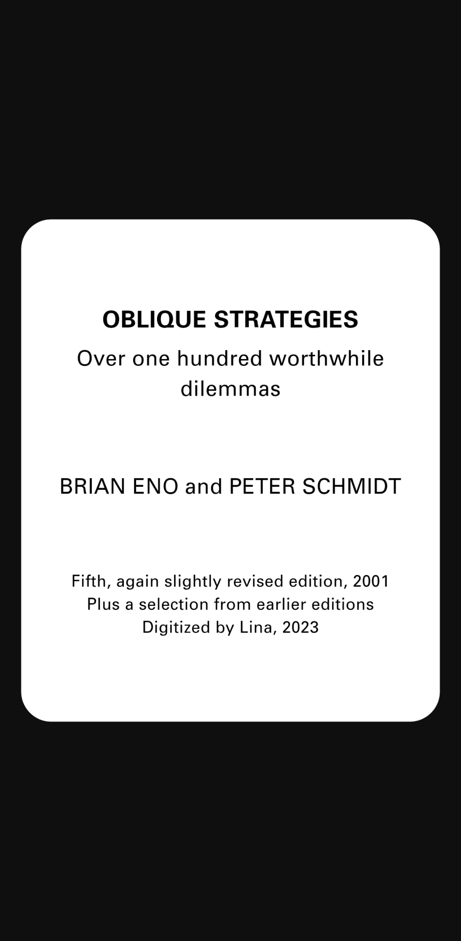 First published by Brian Eno and Peter Schmidt in 1975, Oblique Strategies is a tool for working past creative blocks and reorienting (or disorienting) thought processes.