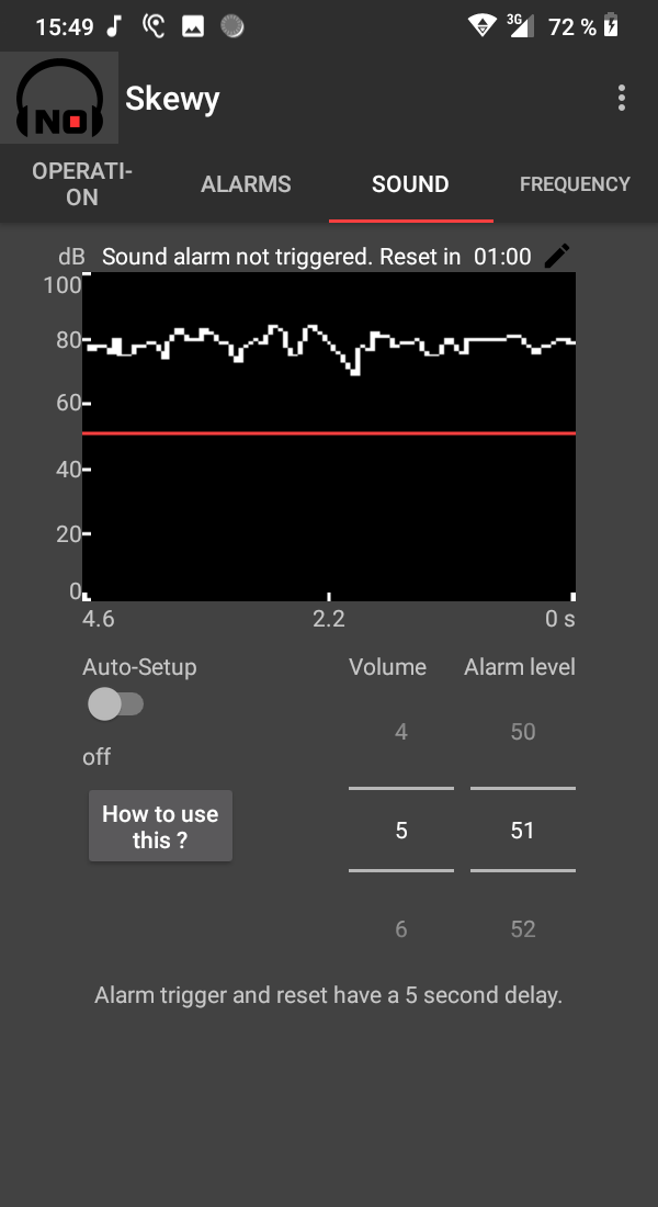 1) By pressing Play, Skewy's sound will mask your conversation / will make the data picked up by the microphone unusable (like a jammer). Giving someone who wants to use this data a near impossible task to filter out what you said. The Sound Tab allows for fine tuning of the sound level and set an optional alarm to notify when masking no longer occurs.