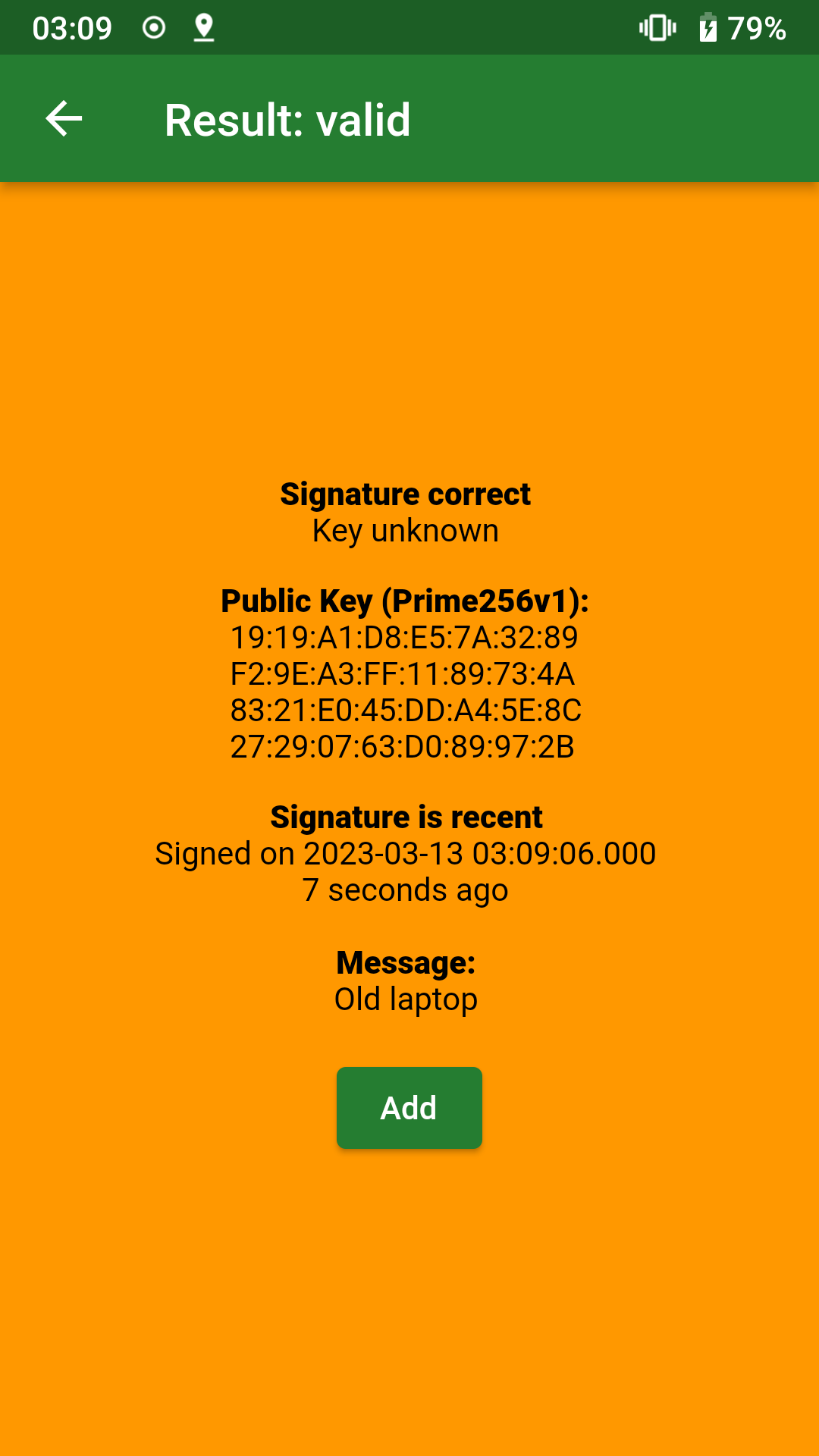 This works as well as the section above but has the same shortcomings. It can be used to verify someone in person when he sends his public key to you in advance over a secure channel.