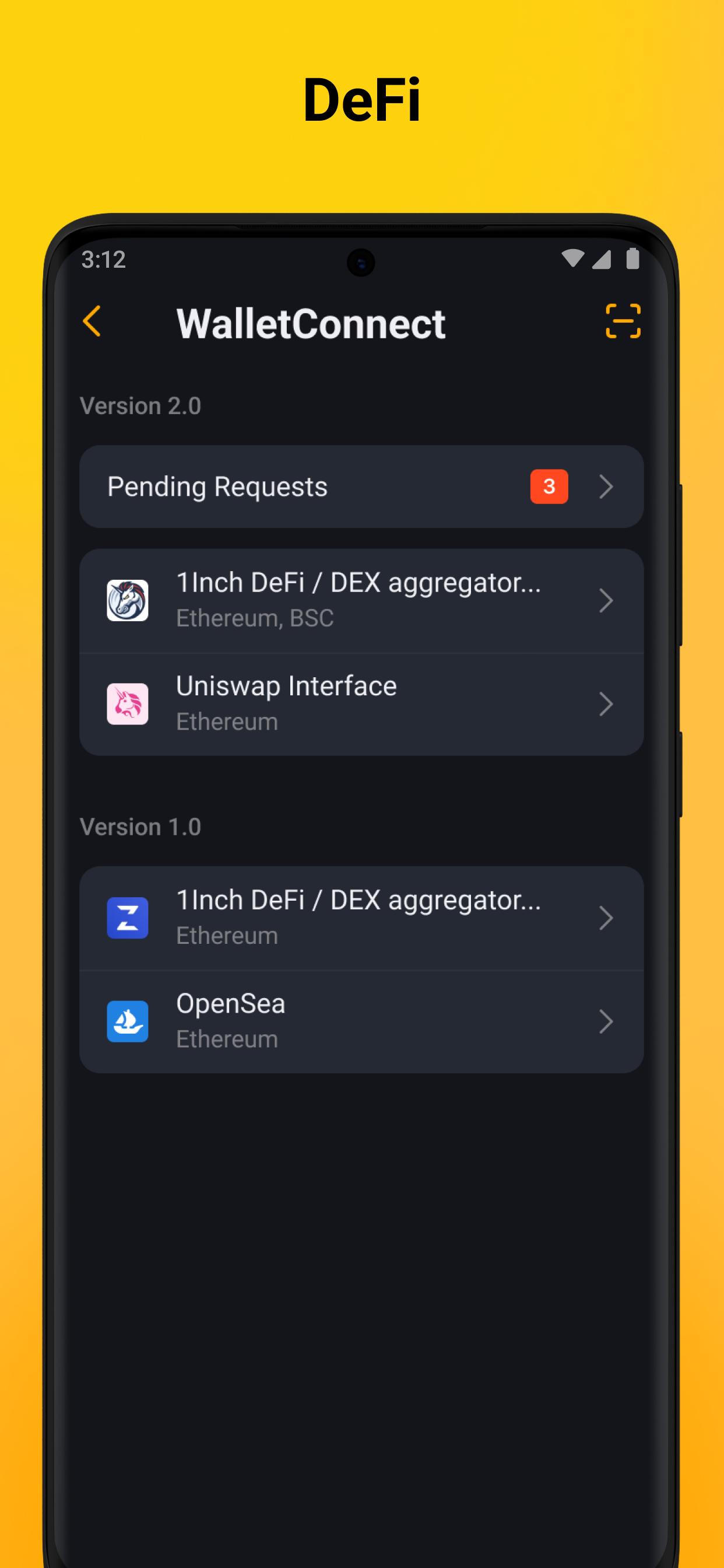 - A DeFi Wallet >> Full support for decentralized token swaps on Ethereum, Binance Smart Chain, Polygon, Avalanche, Solana, and more. Also, the ability to interact with any smart contract-powered service on the blockchain via the WalletConnect protocol.