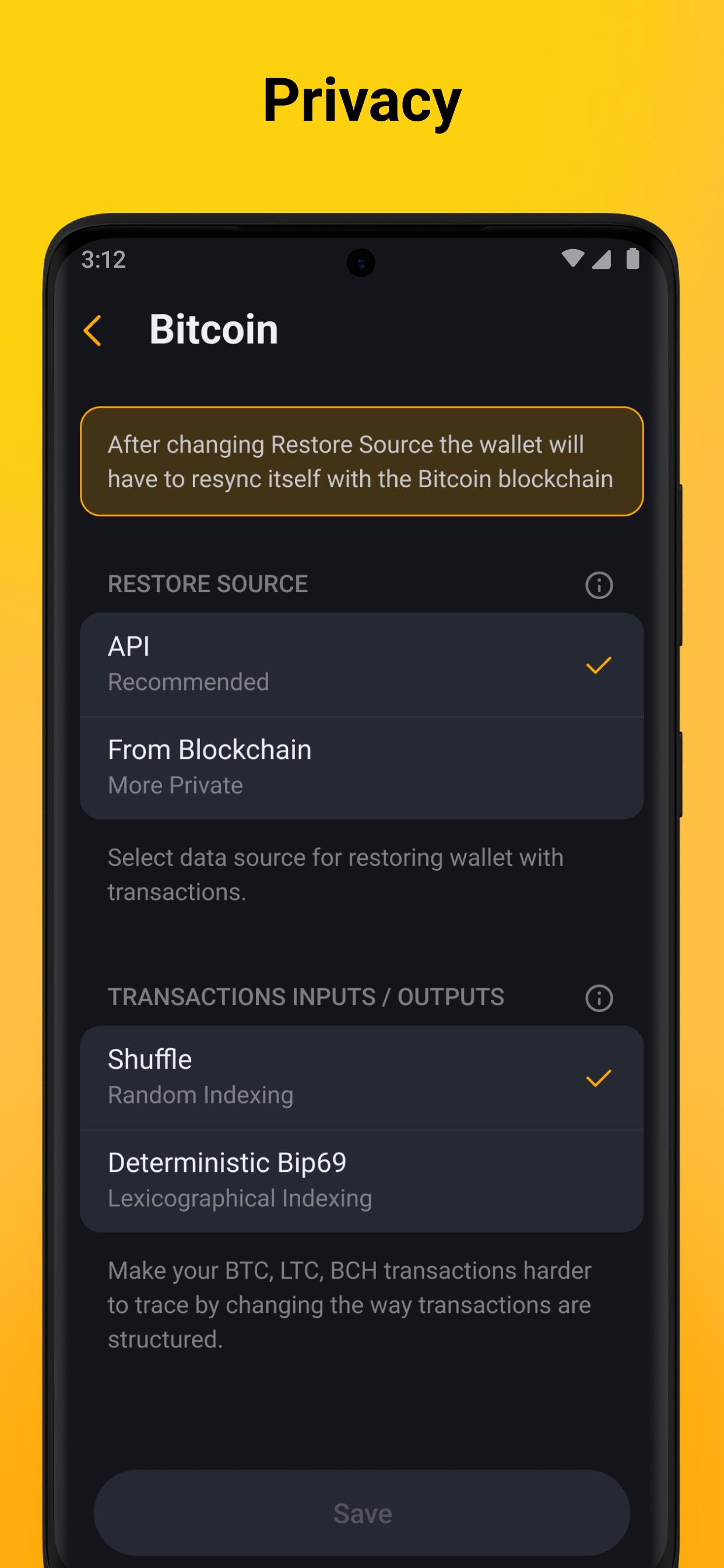 - Privacy Focused >> Designed to allow for privacy even in the most privacy-breaching scenarios. There are no user accounts keeping your records, no identity checks that risk exposing your financials to the world, and no interaction with traditional finance layers. The app is partially TOR enabled and VPN support coming soon.