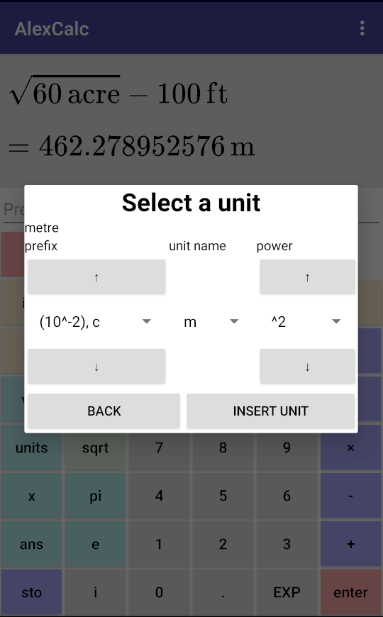 * units in equations, and conversion (e.g. `1 inch * 3 ft to cm^2` or `sqrt(60 acre) - 100 ft`)