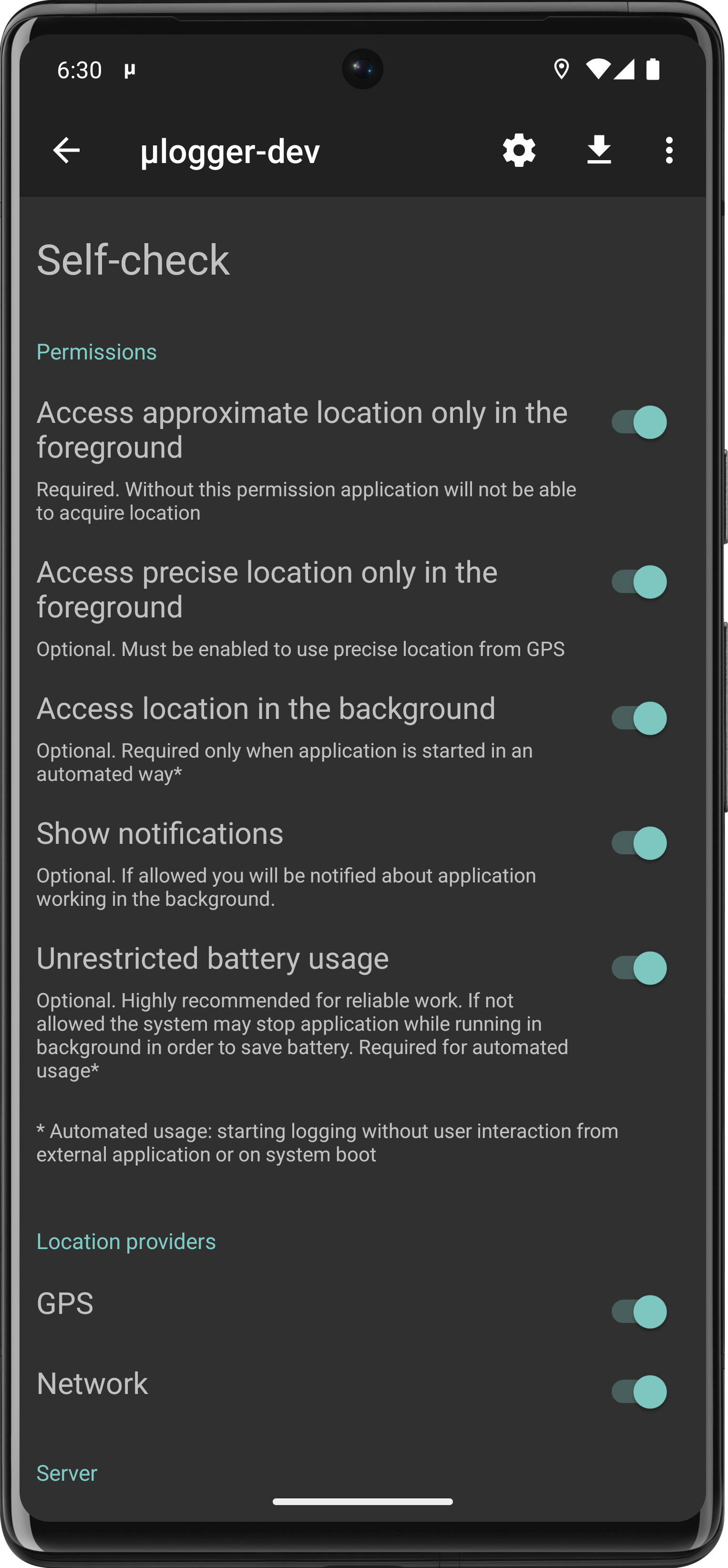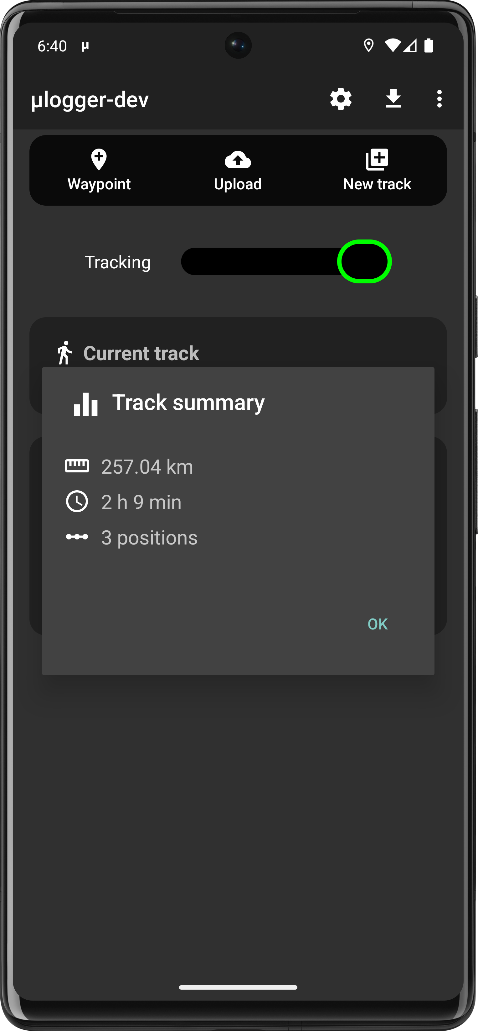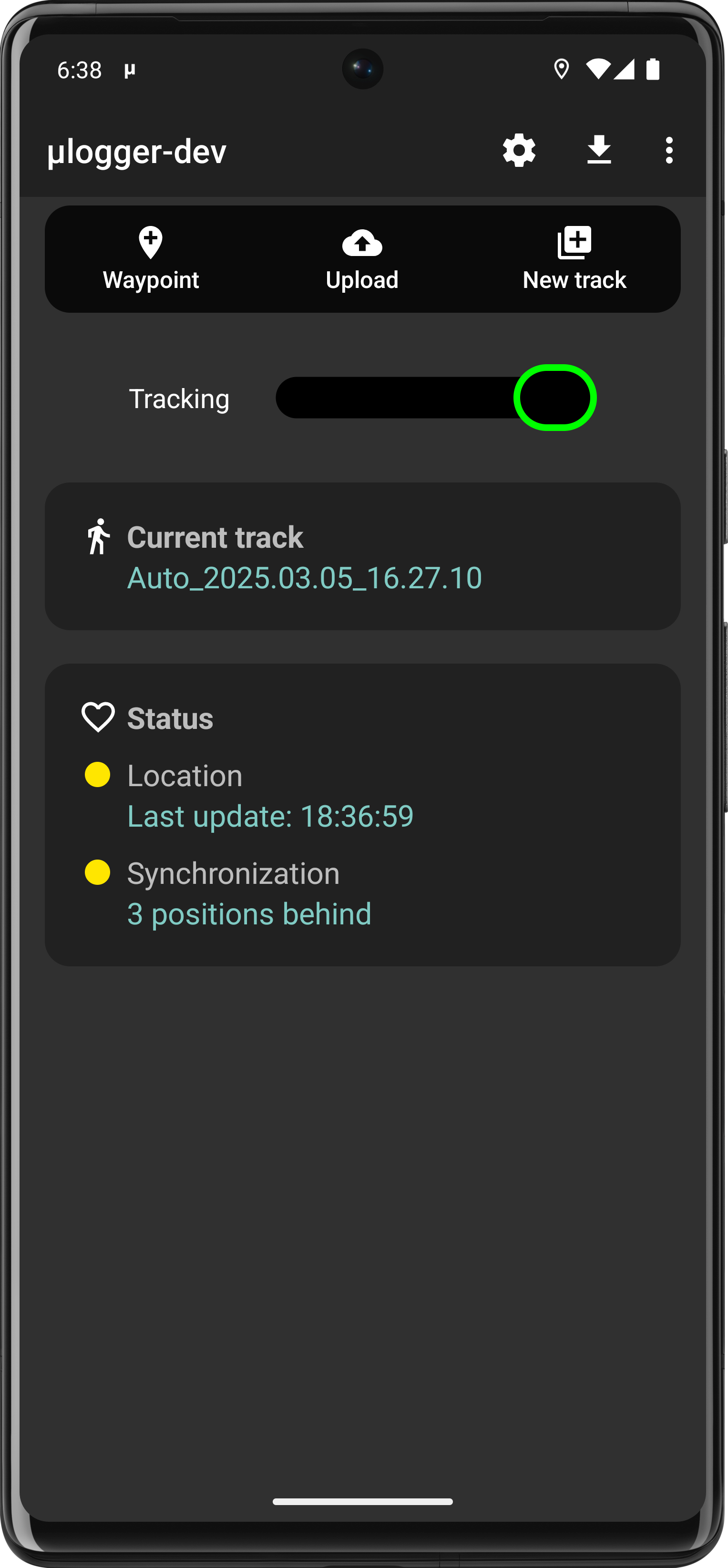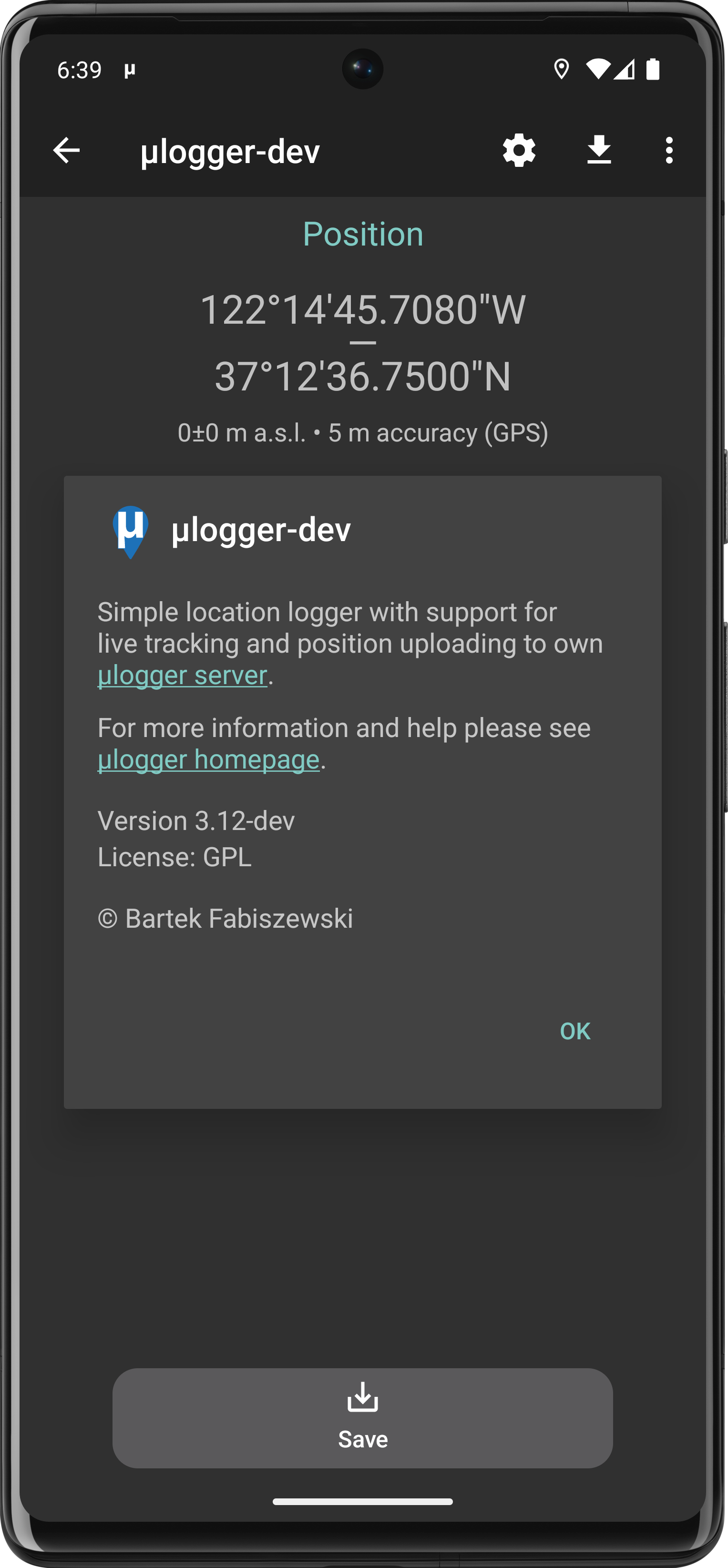 μlogger ('micro-logger') is an application for continuous logging of location coordinates, designed to record hiking, biking tracks and other outdoor activities. Track points are saved at chosen intervals and may be uploaded to dedicated server in real time.