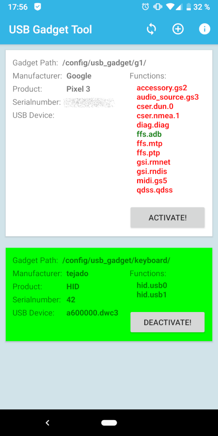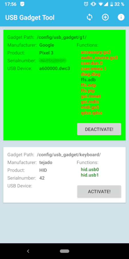 USB Gadget Tool requires root permissions and a Kernel with ConfigFS support. Currently the app only enables the USB Gadget. For the usage of these device endpoints (e.g.