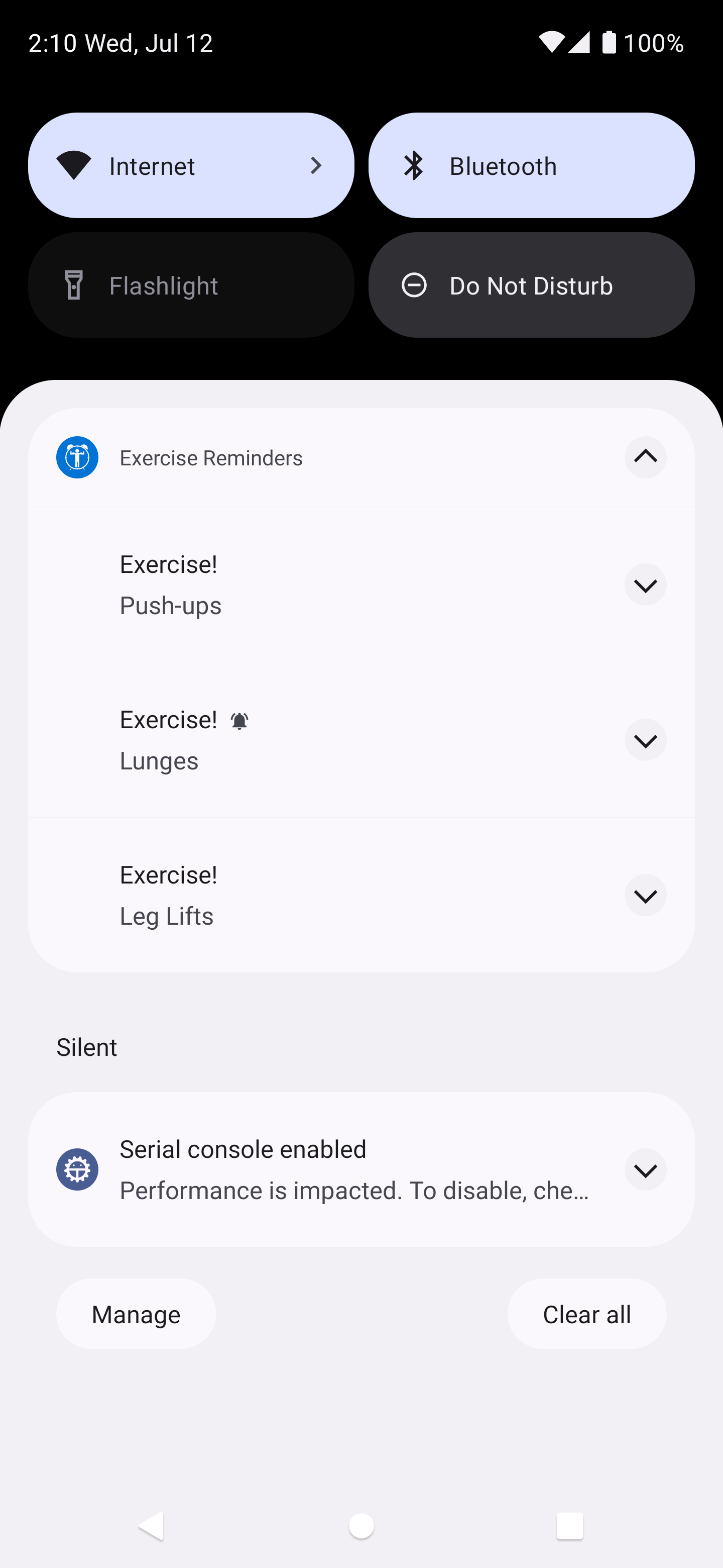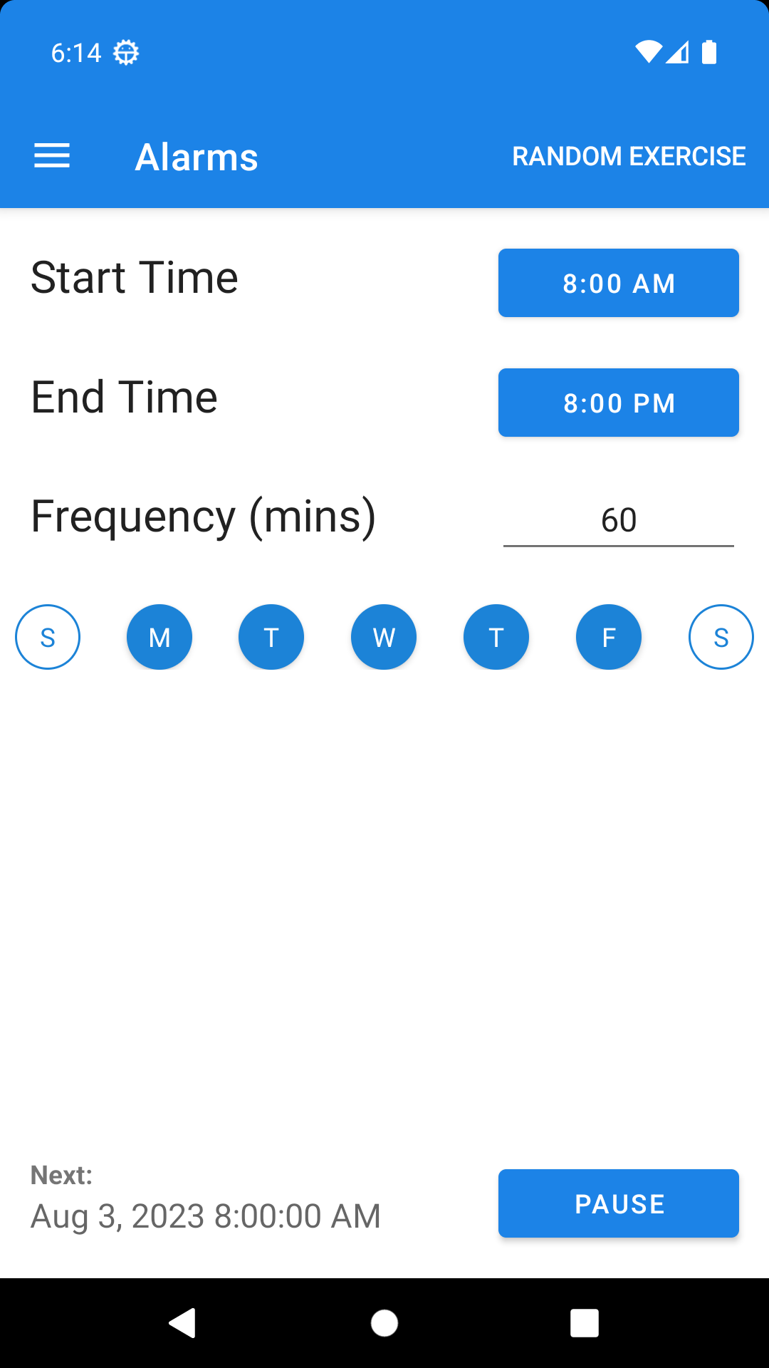 Using a very simple scheduling scheme (start time, end time, and frequency), schedule notifications to remind yourself to perform simple exercises. The bank of exercises is configurable - categories and individual exercises can be enabled/disabled, added, and deleted.