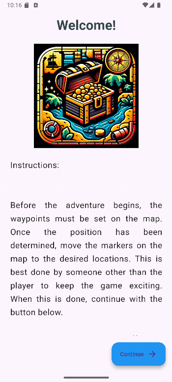 This is an outdoor app that will let you or somebody you like experience a treasure hunt. Define waypoints in your area, then explore those waypoints and solve riddles, until you reach the final stage.