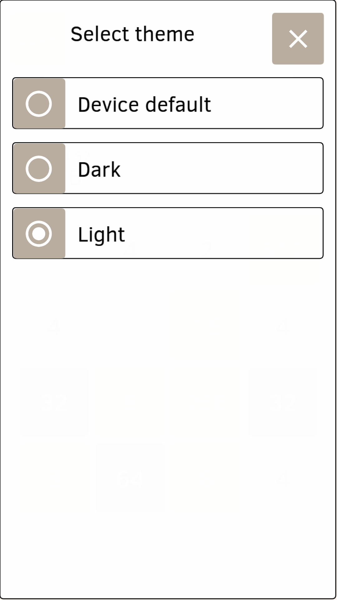 * Select theme for the app: Device default (for Android 9+), Dark or Light.