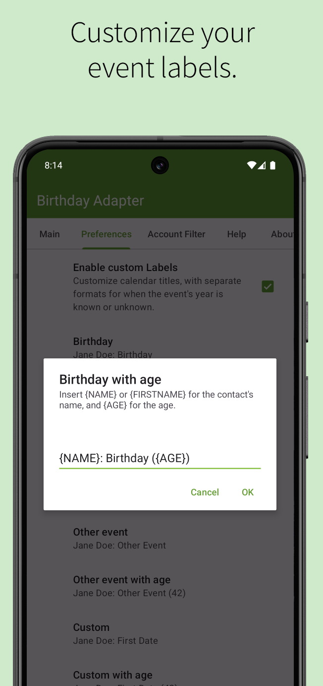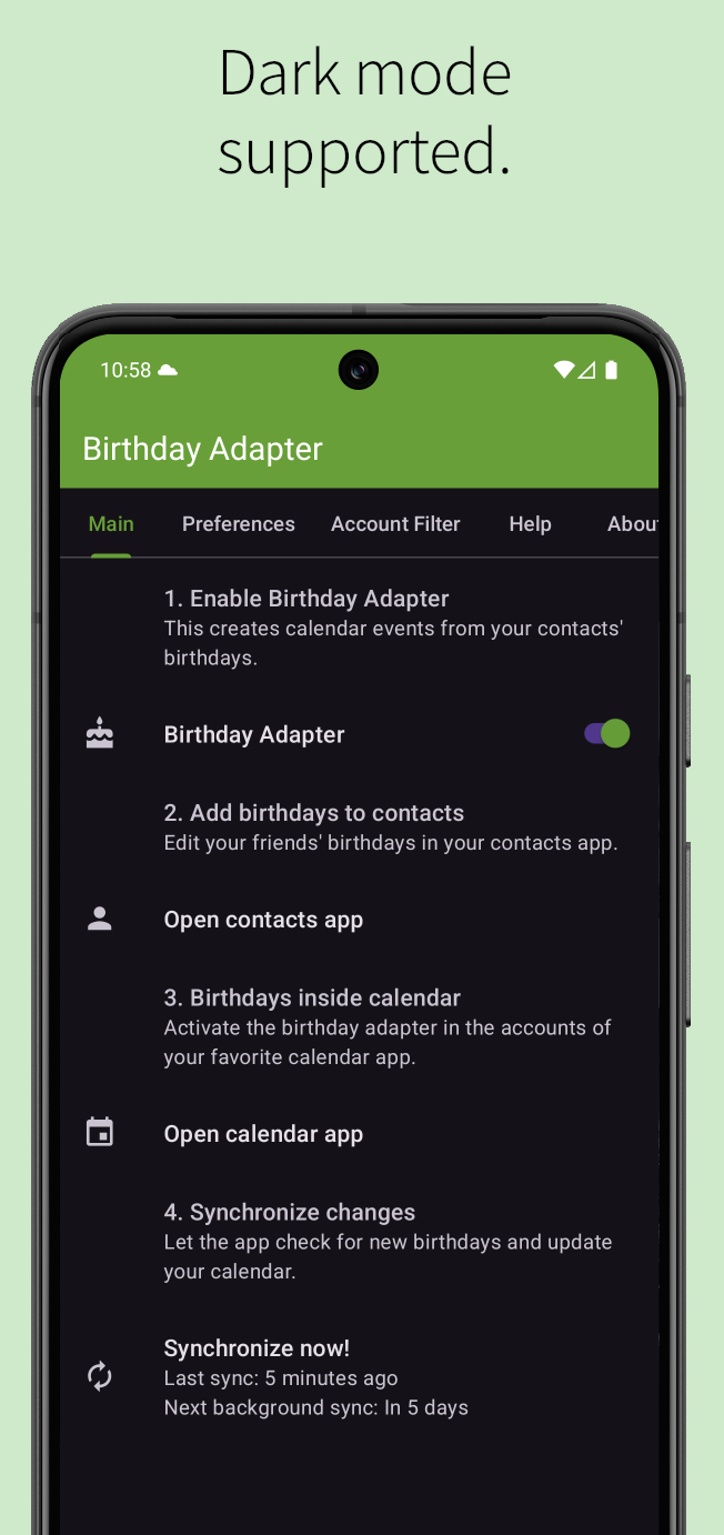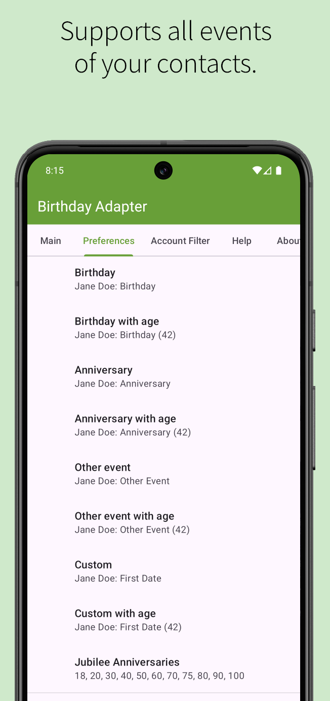 DescriptionBirthday Adapter provides birthdays, anniversaries, and other events from your contacts to the Android calendar system, which is displayed in your standard Android calendar application.