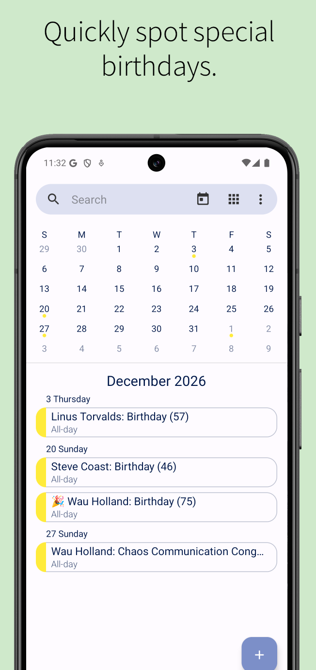 Features• Total integration of birthdays, anniversaries, and other events from Android's contacts to the Android calendar system