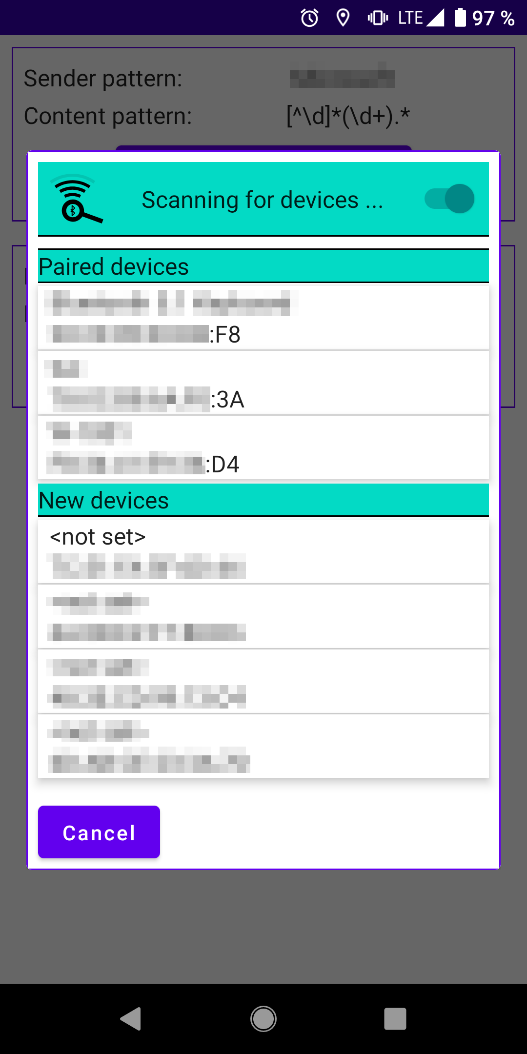 - If the 2FA code could be extracted, a foreground service will be started (status bar) and the app tries to connect to the configured Bluetooth adapter and sends the code. It retries for some amount of time and reports the status in the status bar. Note: The notification in the status bar doesn't automatically disappear. However, this doesn't consume any resources and can be removed using the Stop button.