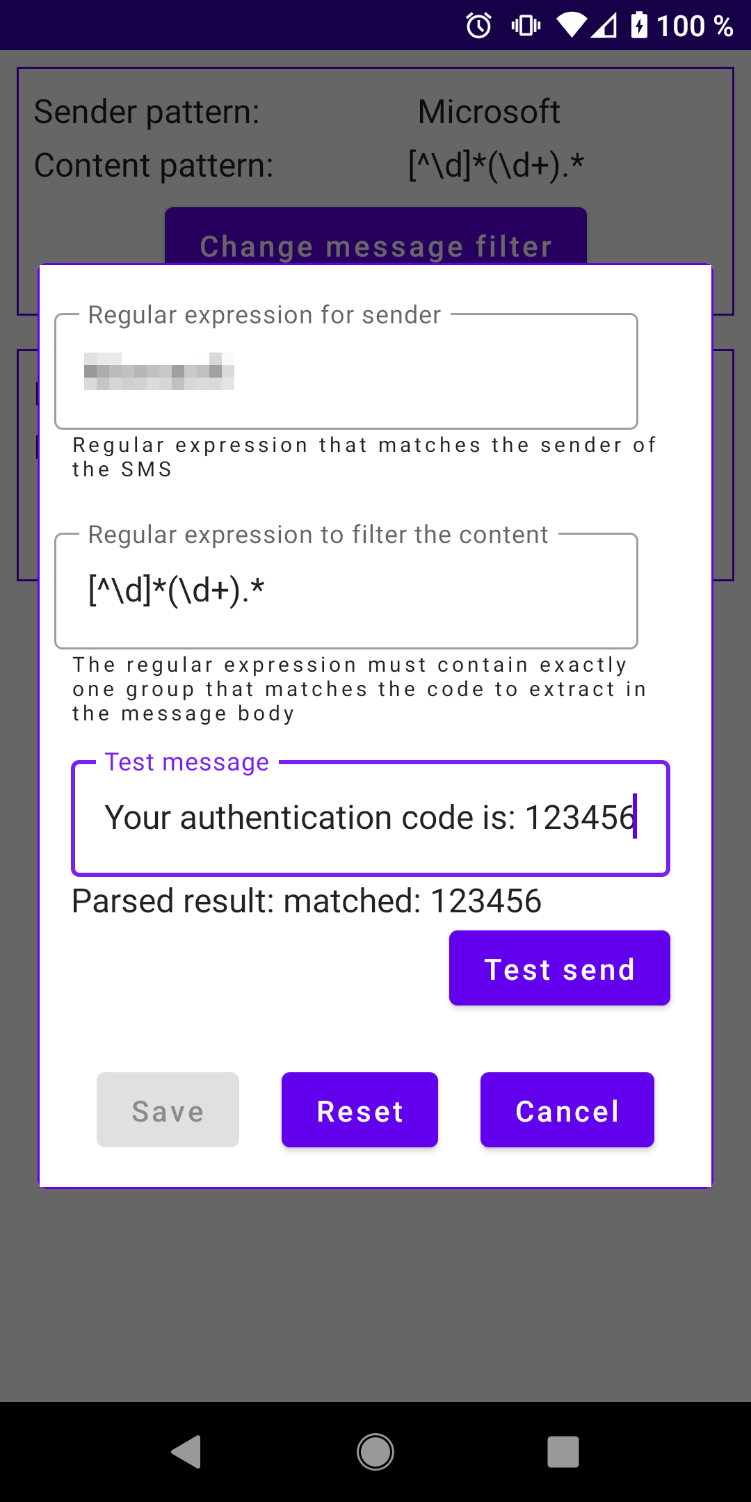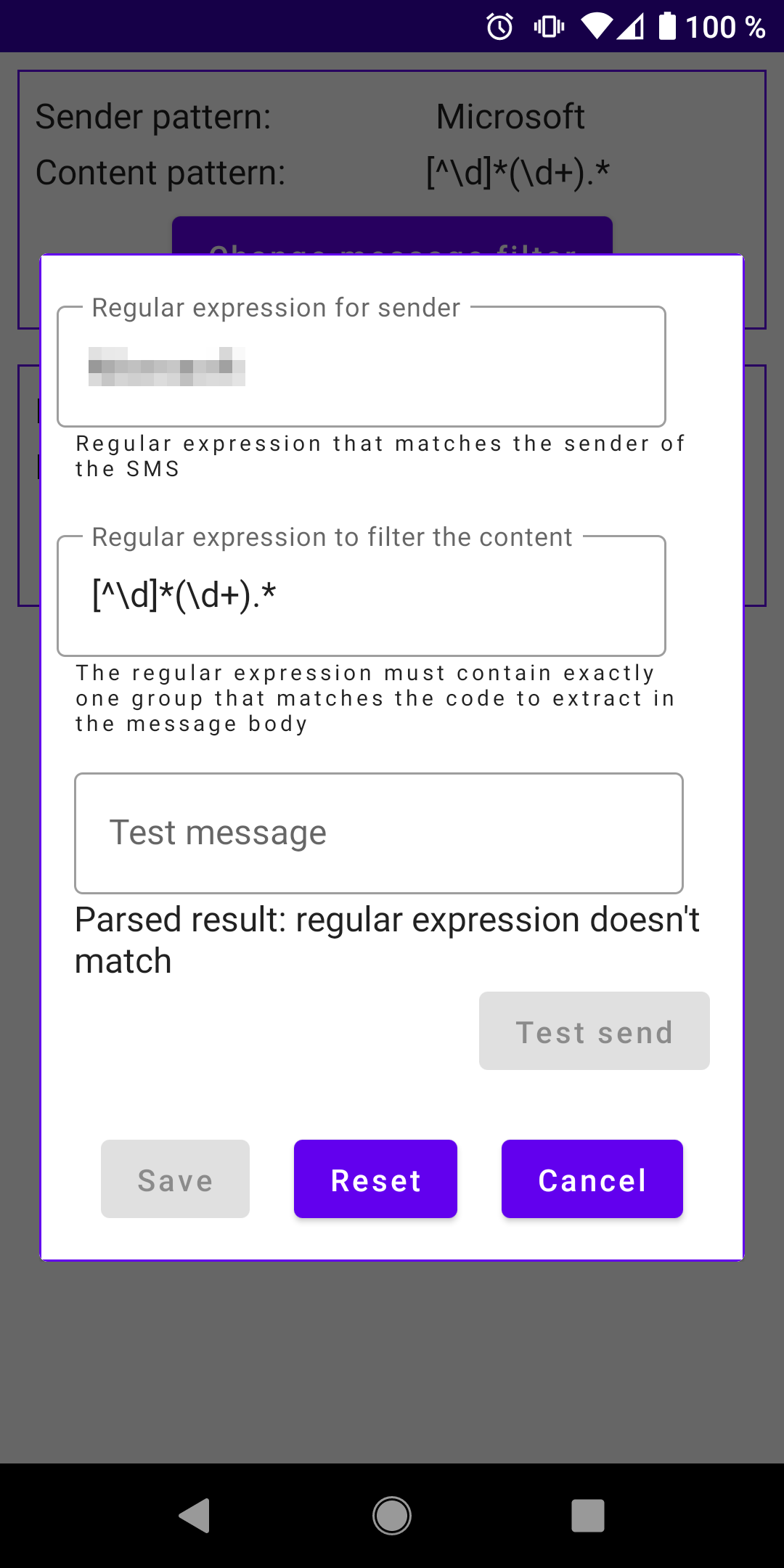 Regular expression to filter the content has to be set to a regular expression that matches the messages you want to catch. Additionally, it has to define one group to extract the actual code that has to be sent to the PC.