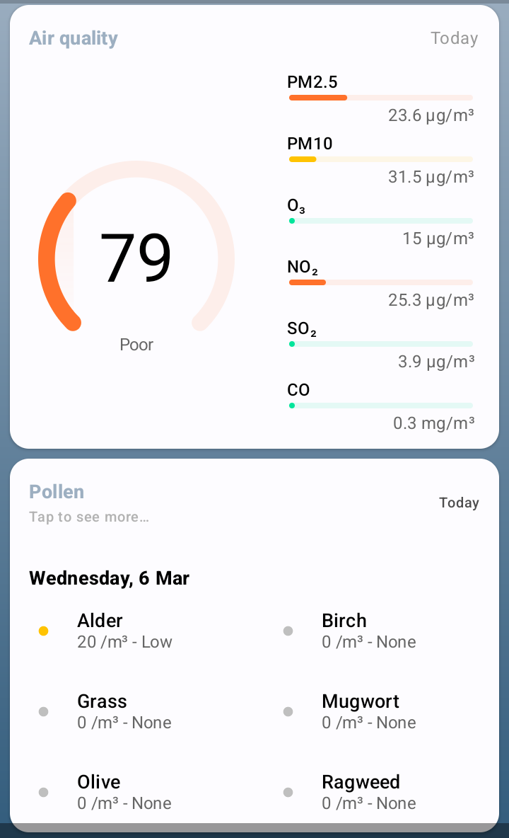 - Air quality, allergen and ephemeris information