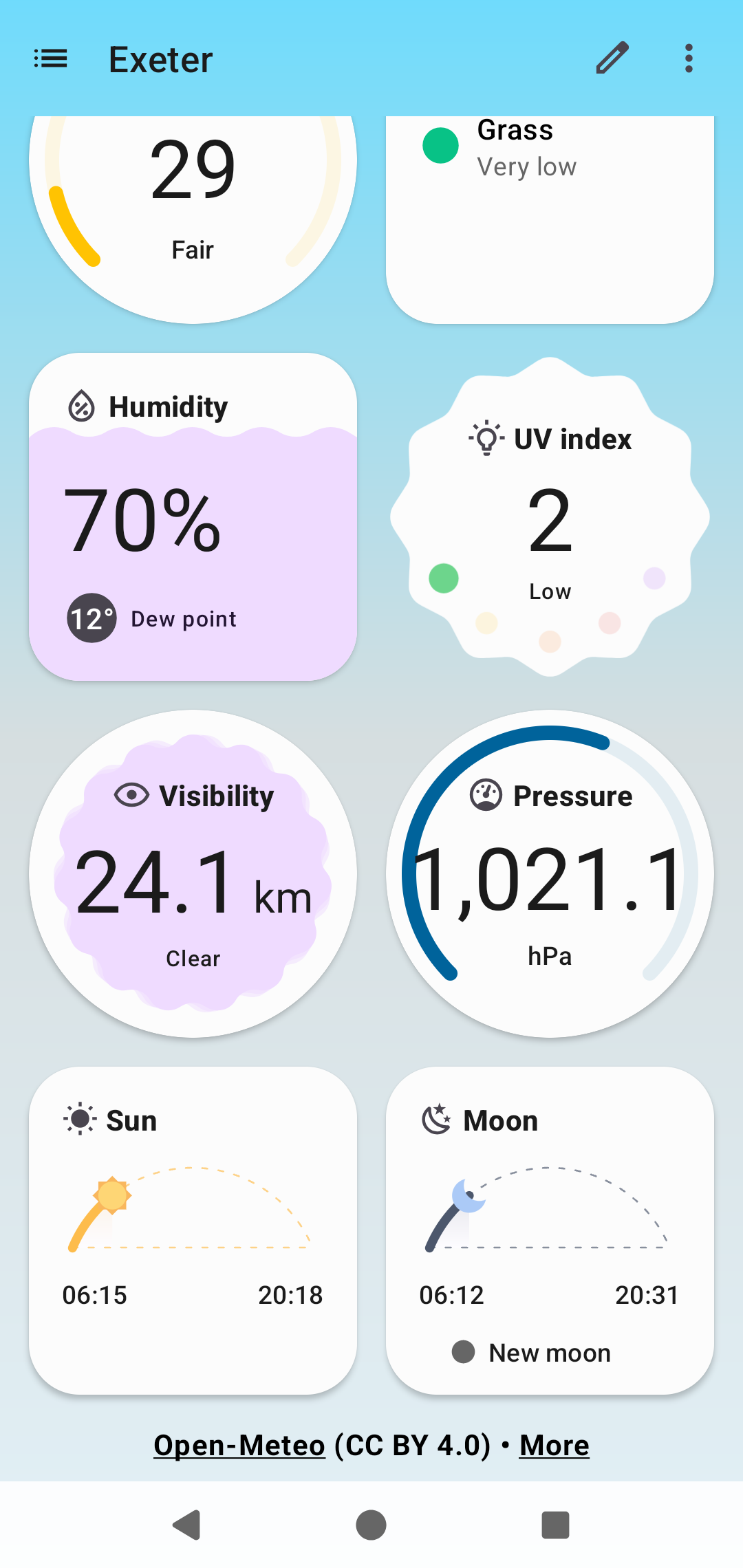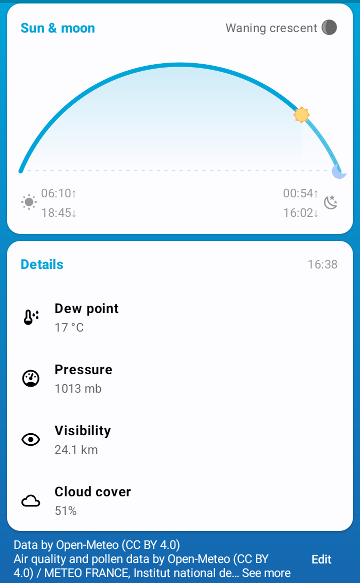 Breezy Weather is a feature-rich free and open source Material 3 Expressive weather app with well-though-out visualizations, supporting forecast, real-time weather conditions, nowcasting, air quality, pollen, alerts, from more than 50 weather sources, such as NWS, Met Office UK, Met Éireann, ECCC and Open-Meteo.