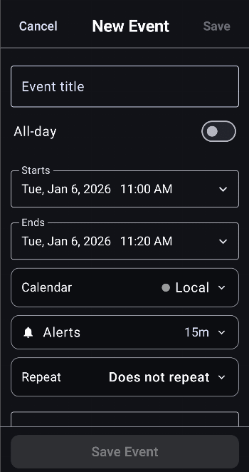 All operations save locally first. Sync happens in the background — your calendar works even without internet or any external calendar service.