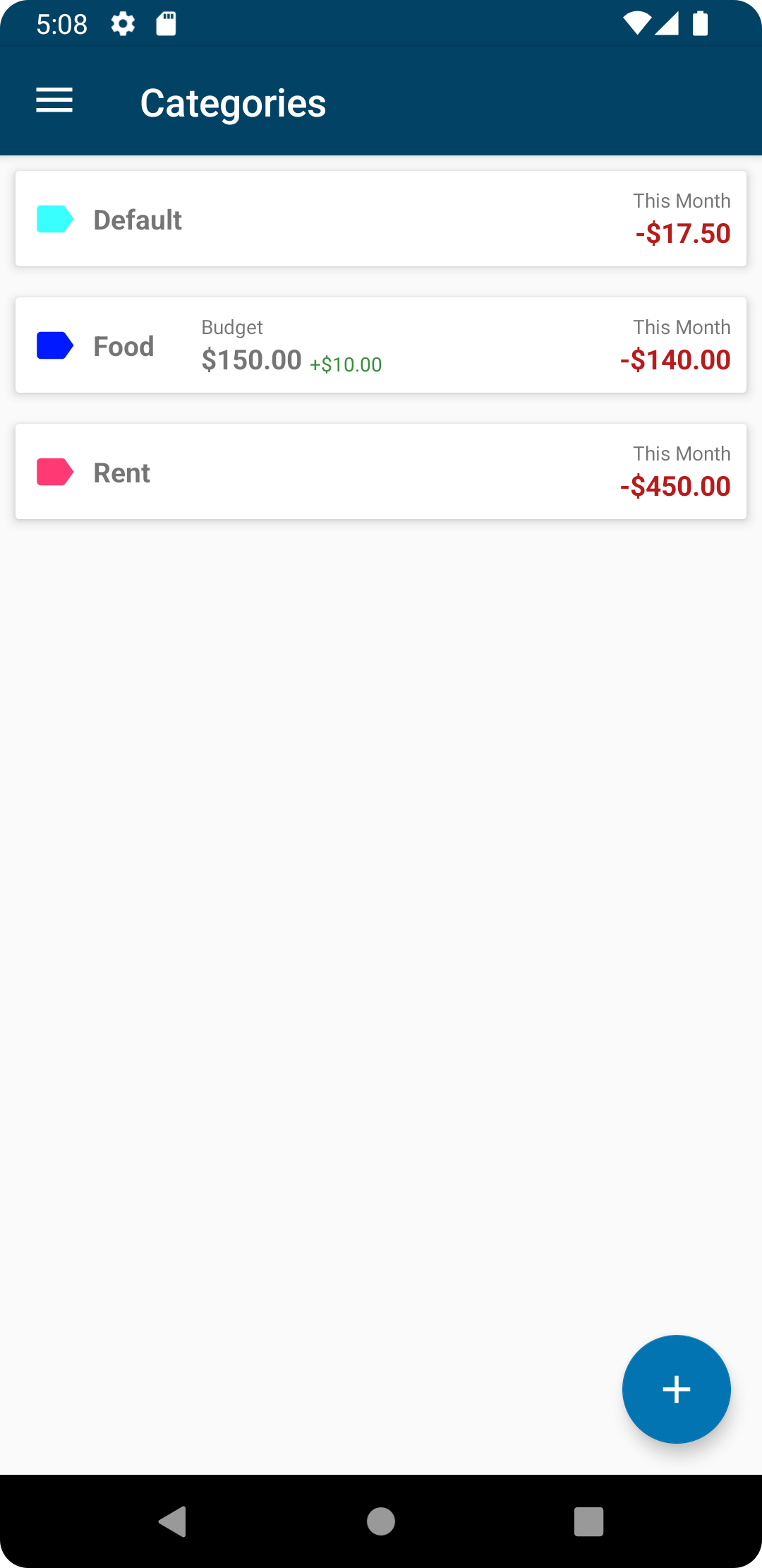 Under the menu item “Categories” you can see all the categories you created and their total balances, depending on the transactions that are labelled with the respective category. By clicking on the Plus-Button in the bottom right corner you can create new Categories. By long-clicking on the entry you can either edit or delete the category.