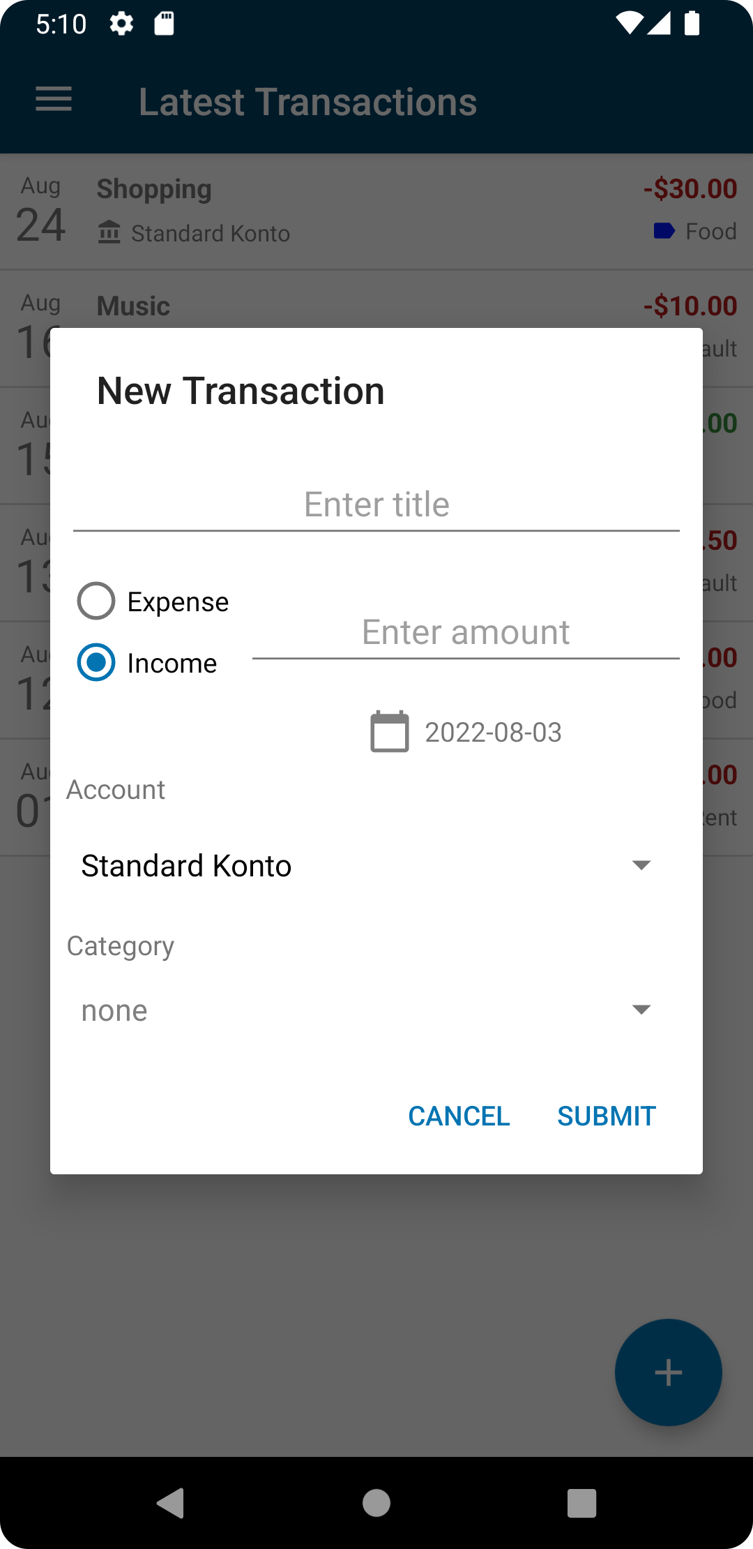 You can create new expenses by clicking on the Plus-Button in the bottom right corner in the main view. Now you can enter the amount, a title, a date and a category. Furthermore, you can specify if the transaction is an expense or income.