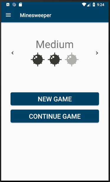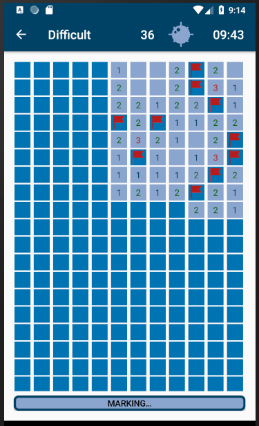 In addition there is the option to create your own gamemode where the size of the playing field (amount of rows and columns) and the proportion of mines (easy / medium / hard).
