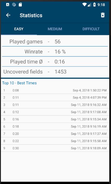 Up to 10 games can be saved and later continued. Your Performance for the three basic gamemodes is collected and analyzed and can be viewed at the statistic page. There you can check the number of games played, the ratio of won games, the average time of winning mgaes, the number of revealed fields and the 10 best times for each gamemode.