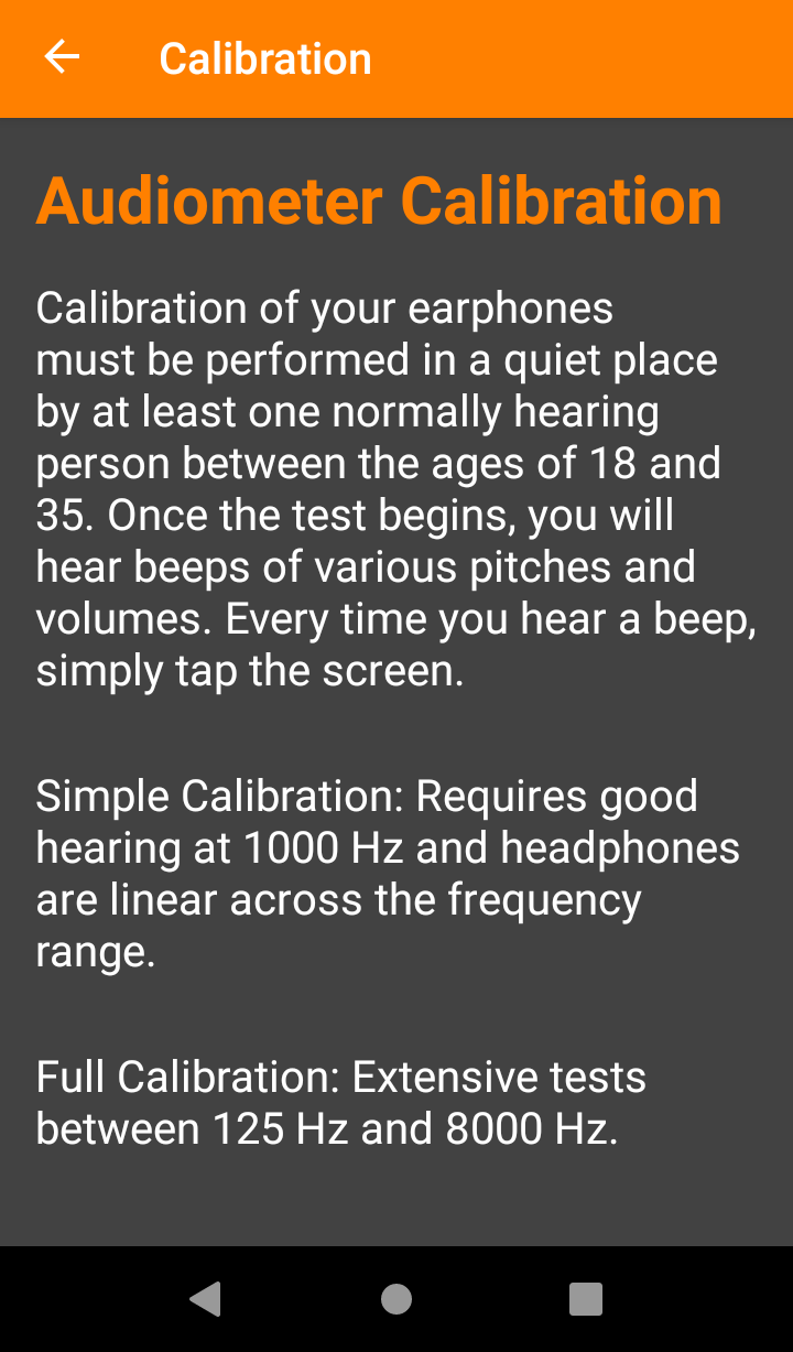 First your earphones must be calibrated. You can either perform a full test which requires one or better several persons between the ages of 18 and 35 with normal hearing. Or you can perform a simple calibration at 1000Hz only (assuming good hearing at this frequency). In this case it is assumed that the earphones are linear across the frequency range and calibration values for the other frequencies are then calculated using the ISO226:2003 standard. Whenever you hear a beep simply touch the screen. You can pause / continue with a long click and speed up with a double click. If you have several persons available for calibration simply press "Add Calibration" and an average value of existing calibrations will be calculated. You may also delete the whole calibration.