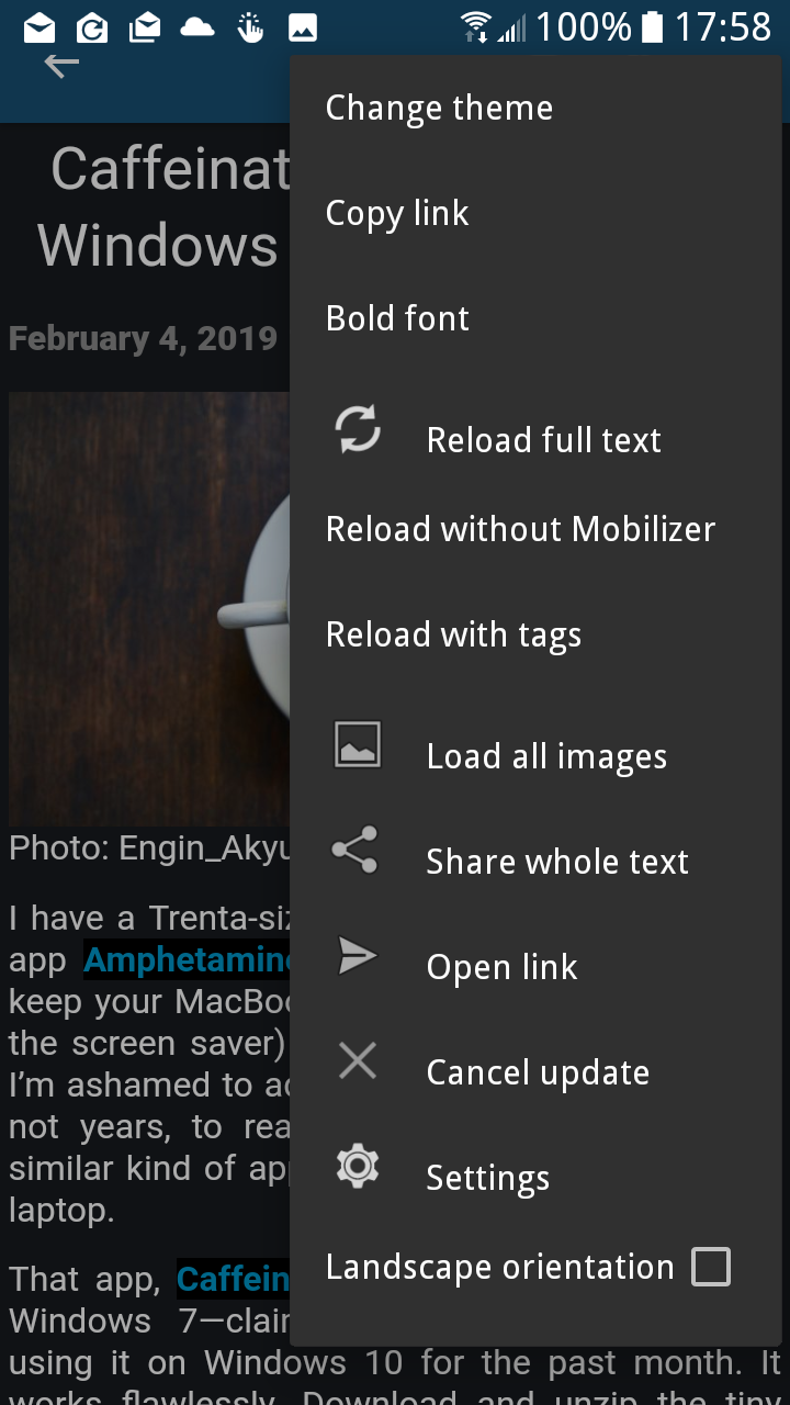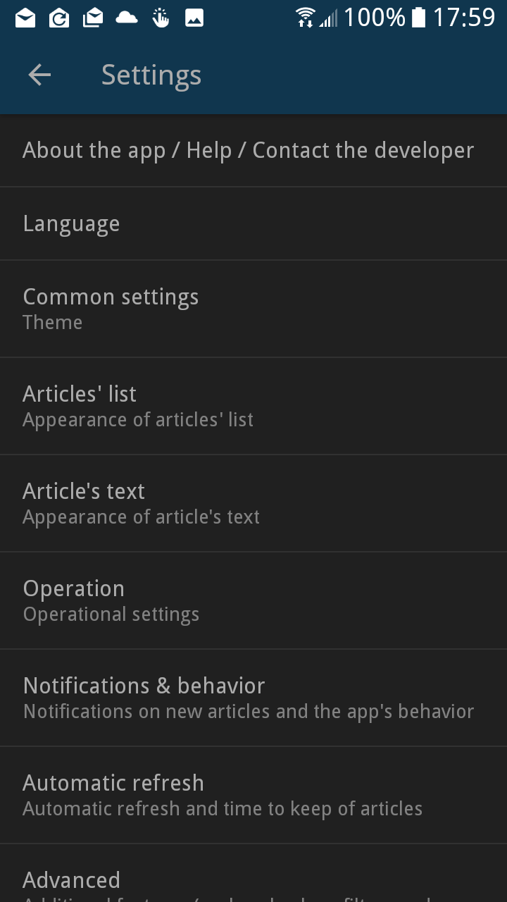 - convenient reading: switching articles by volume buttons or swipe, Tap Zones, remembering the position of reading per article,