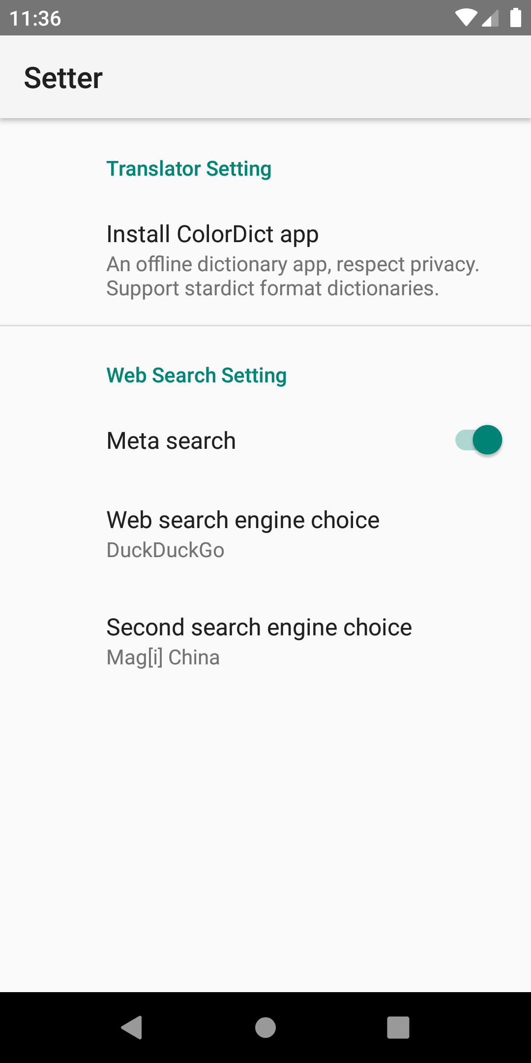 Setter support and promot search engines which respect user's privacy, like DuckDuckGo, StartPage and Swisscows. Setter also support and recommend using a local dictionary app to guard your reading habit from leaking.
