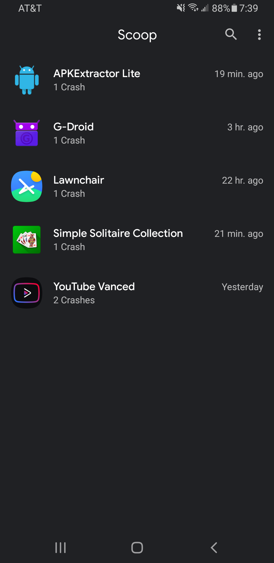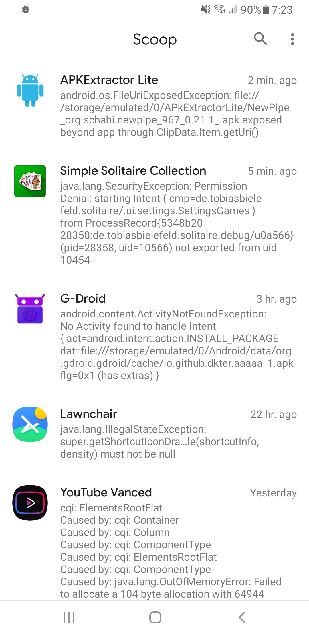 Scoop catches and saves the stack traces of crashing apps and displays all crashes in a list so you don't have to look through annoyingly long logcats anymore.