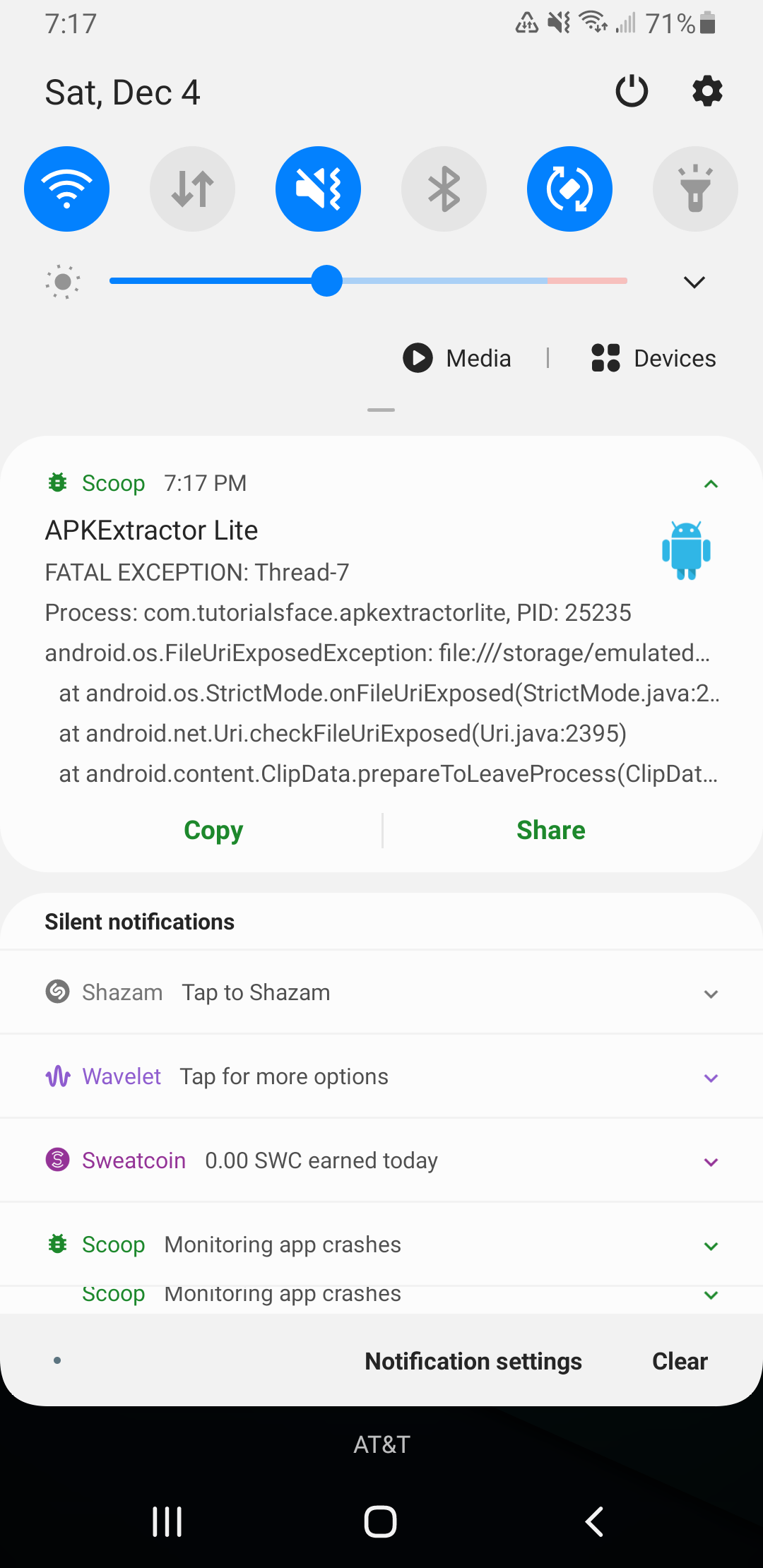 - Quick actions in notifications to copy / share stack traces