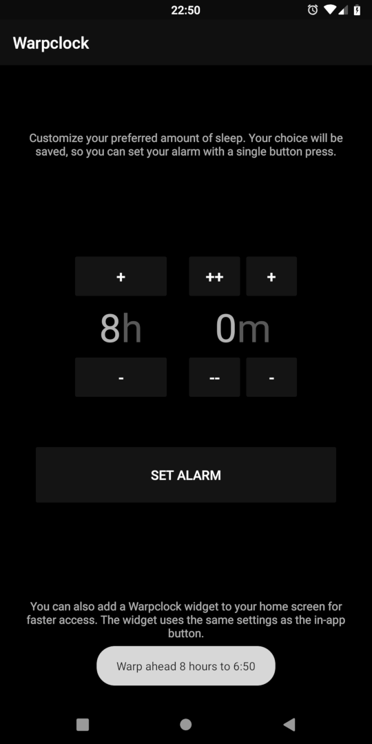 There is also a button labeled "Set alarm" inside the app. Pressing this button will create a new one-shot alarm in your default alarm clock app, configured to wake you up after your personalized amount of time has passed. The alarm will automatically delete itself from your alarm app once it has triggered, keeping your list of saved alarms clean.