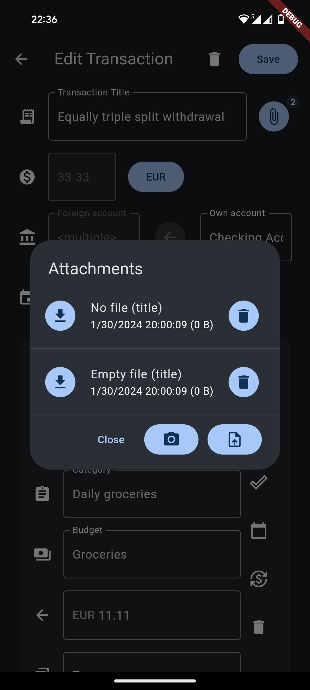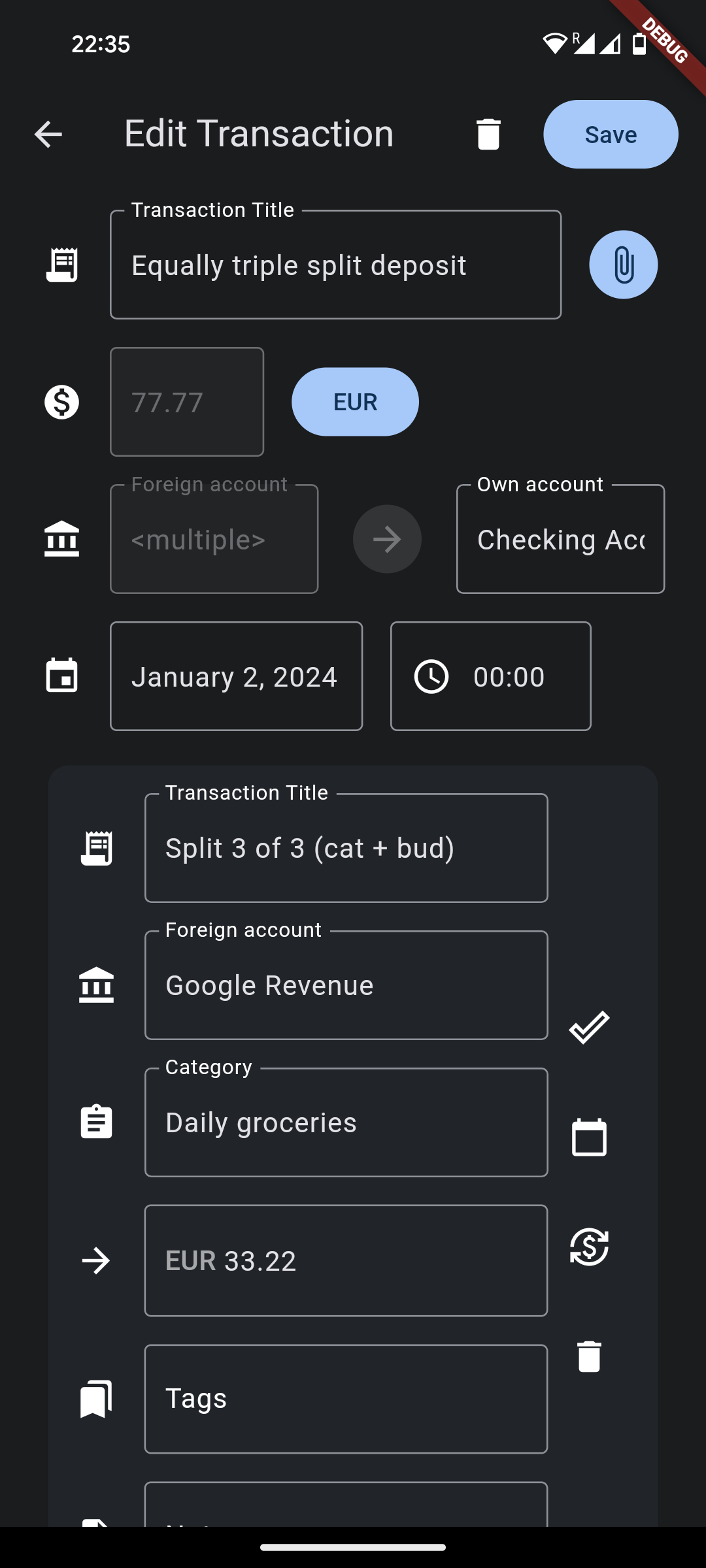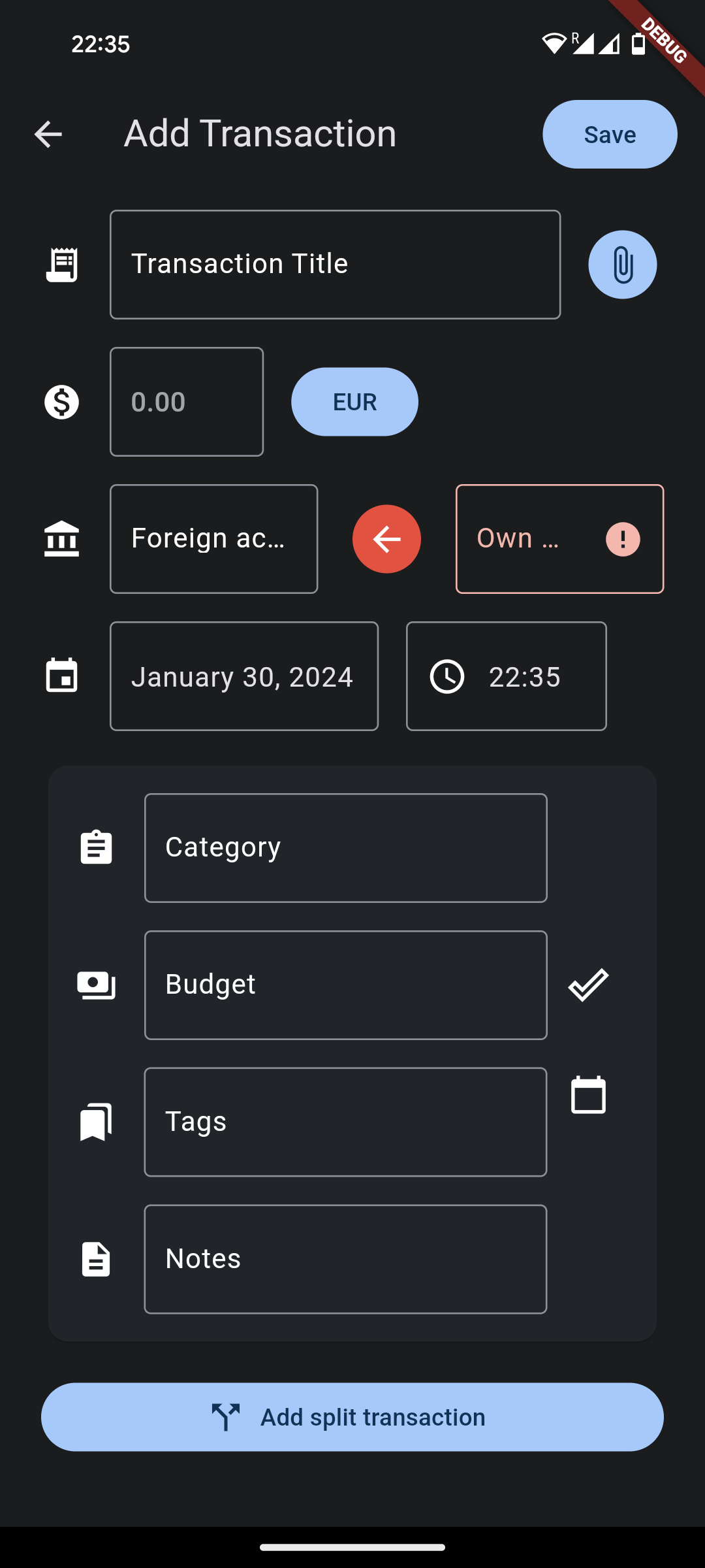 - Add & edit transactions with autocomplete, including attachments, split transactions & multi currency support