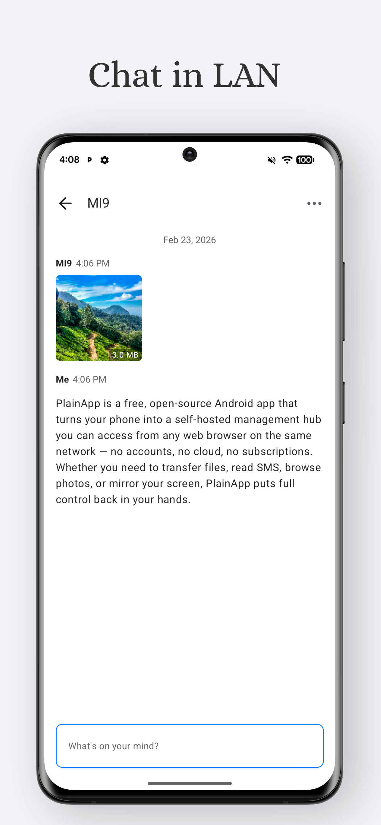 **PlainApp** is a free, open-source Android app that turns your phone into a self-hosted management hub you can access from any web browser on the same network — no accounts, no cloud, no subscriptions. Whether you need to transfer files, read SMS, browse photos, or mirror your screen, PlainApp puts full control back in your hands.
