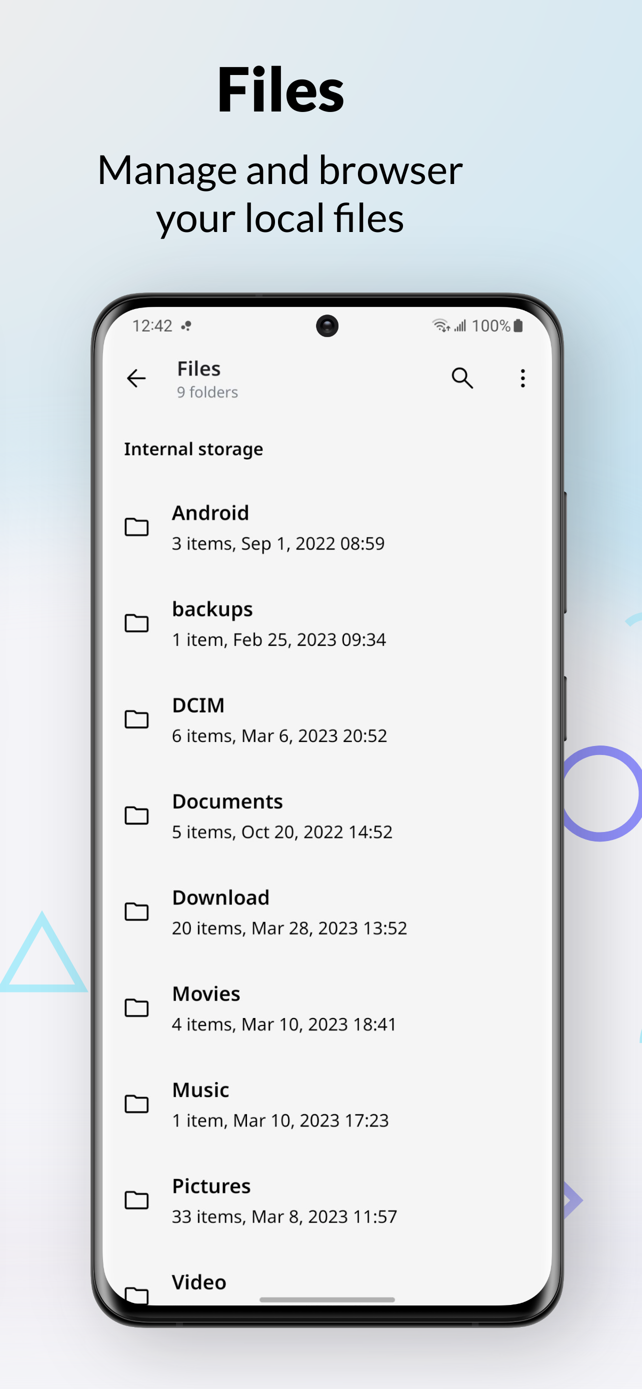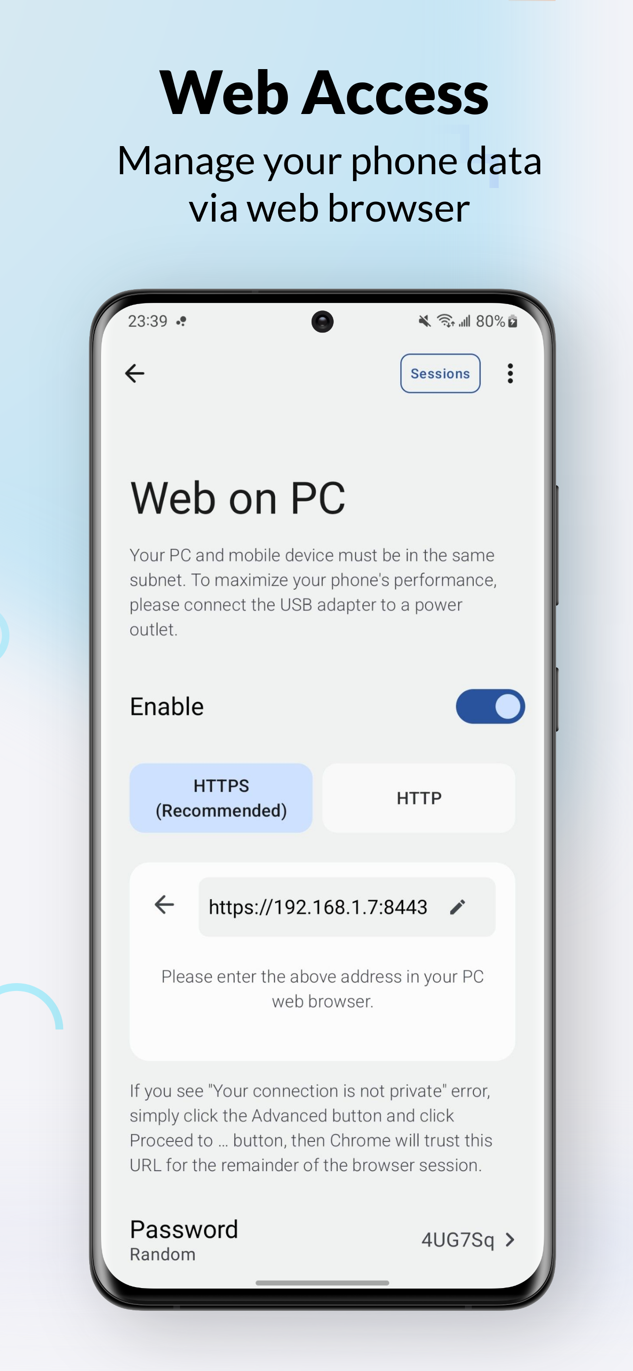 Open a browser on any desktop or laptop connected to the same Wi-Fi network and get a full dashboard to manage your Android device — no app installation required on the computer side. Supports PWA so you can pin it to your desktop like a native app.
