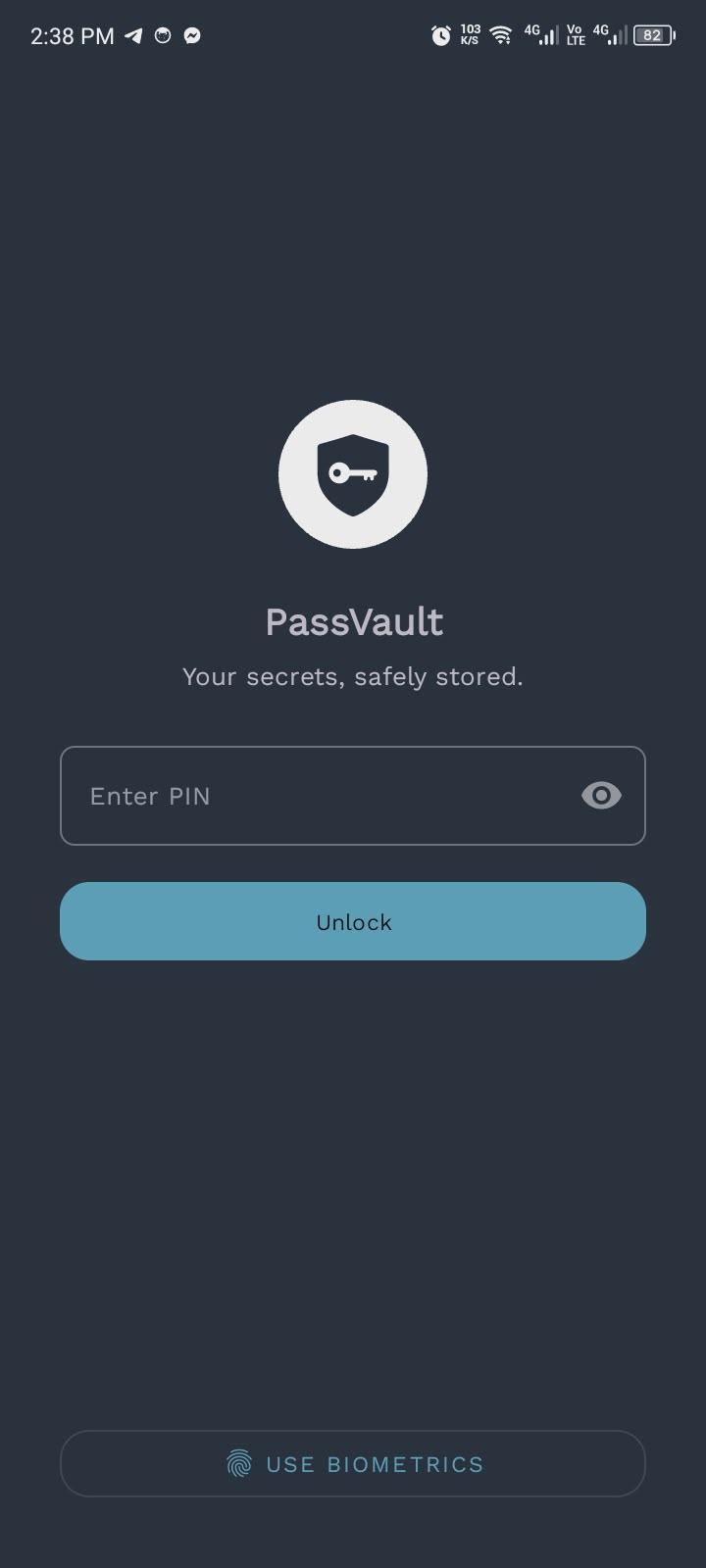 PassVault is a lightweight password manager that allows users to securely store credentials on their device. All data is stored locally and sensitive information is encrypted using the Android Keystore system. The application does not require internet permissions. User data never leaves the device.