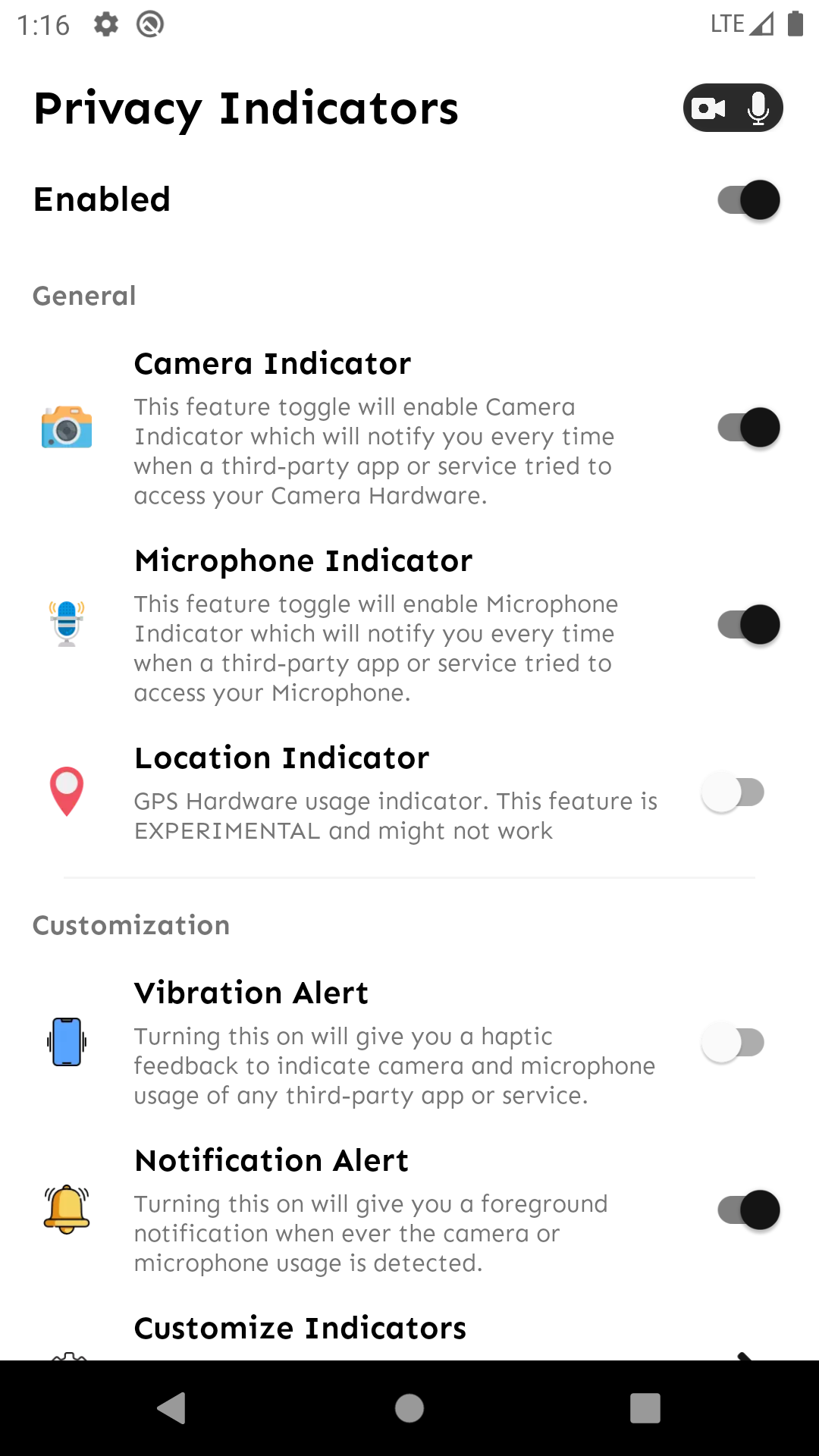 More to come. Note that for ''Privacy Indicator'' to work, you will need to enable its service from the Accessibility Settings. The Service then keeps running in the background and automatically starts even if you restart the mobile.