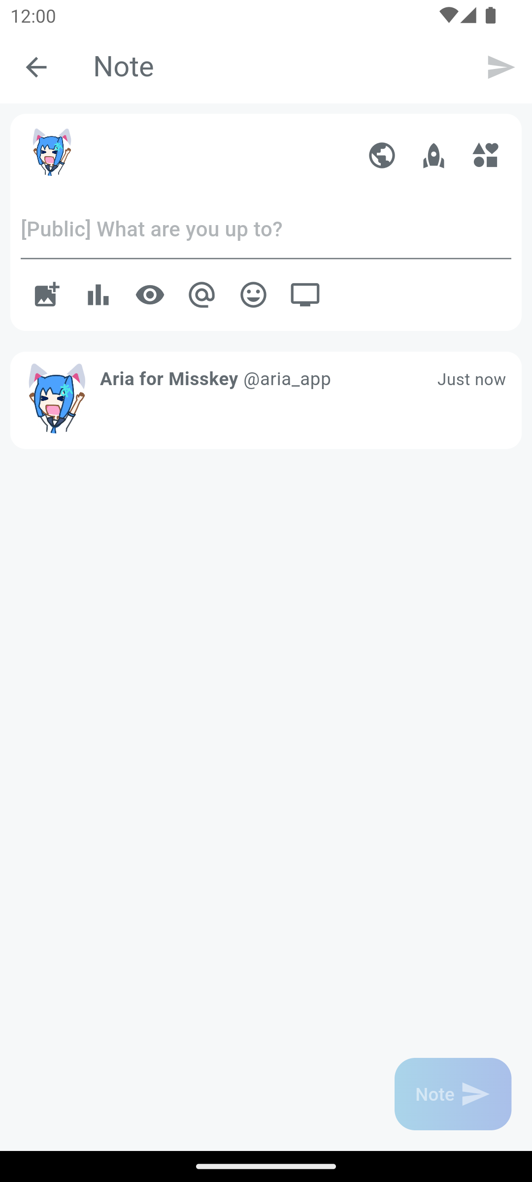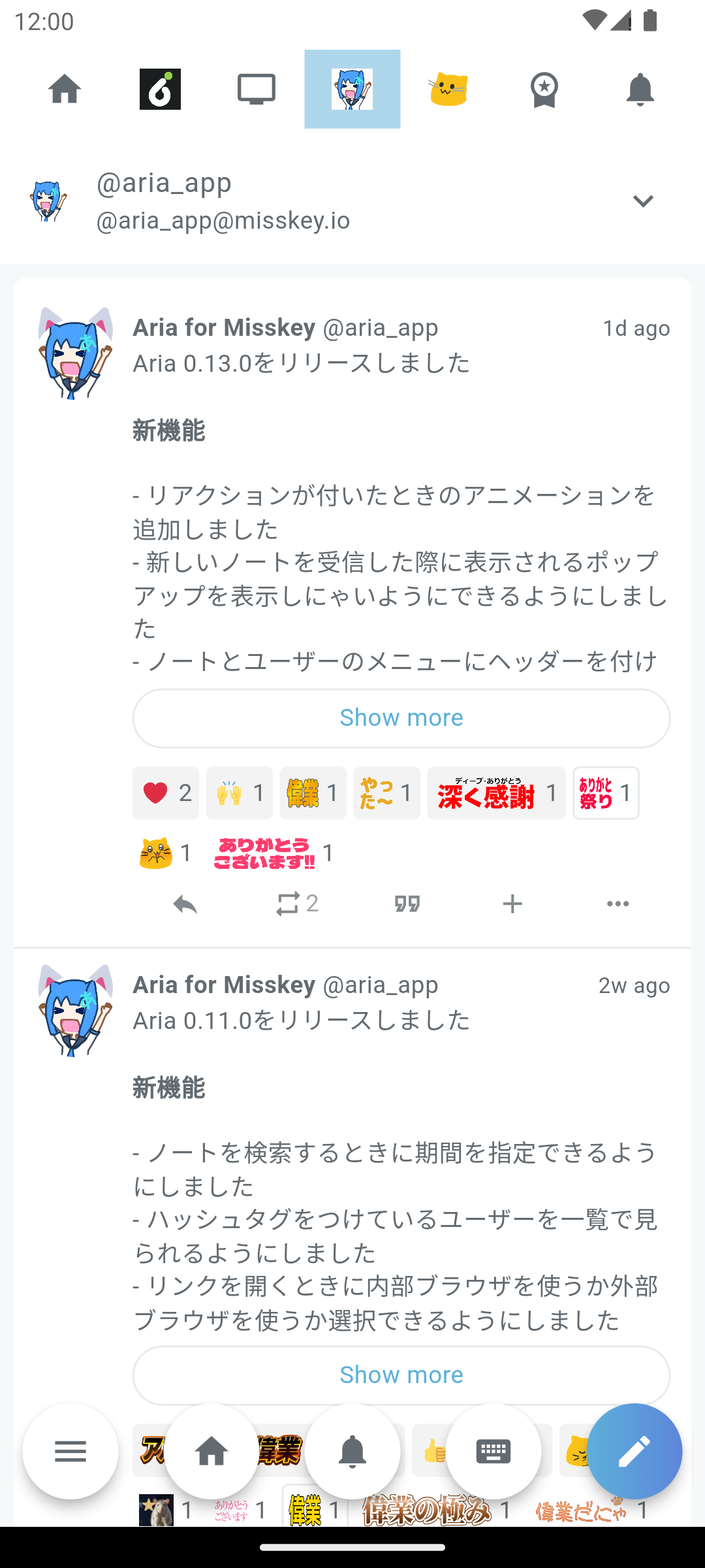 Aria supports most of the functions available in Misskey, including viewing various types of timelines, posting notes, editing clips, lists or antennas, etc.