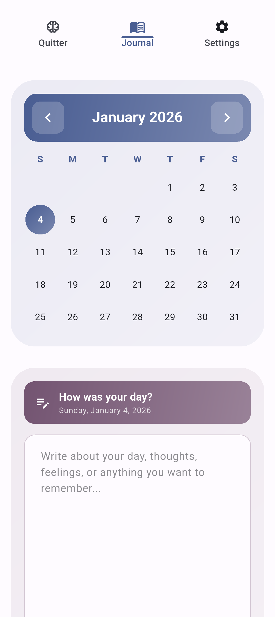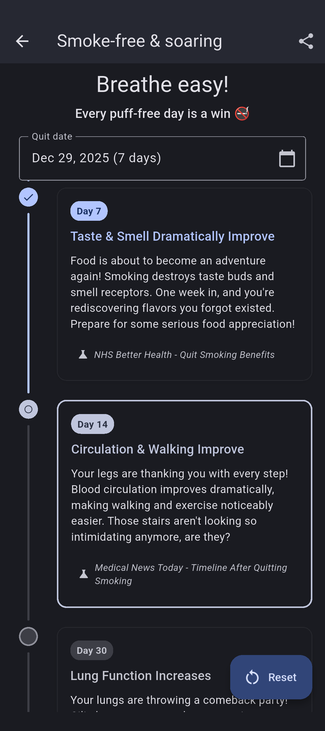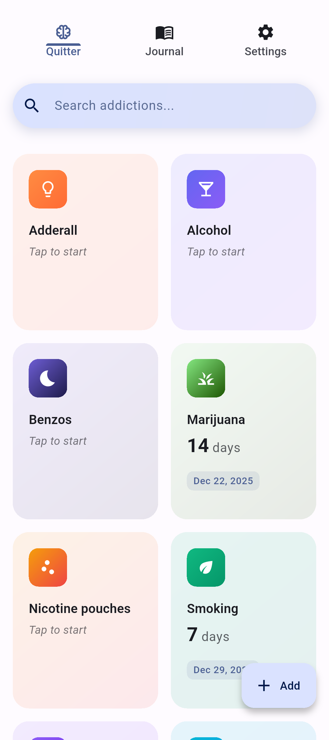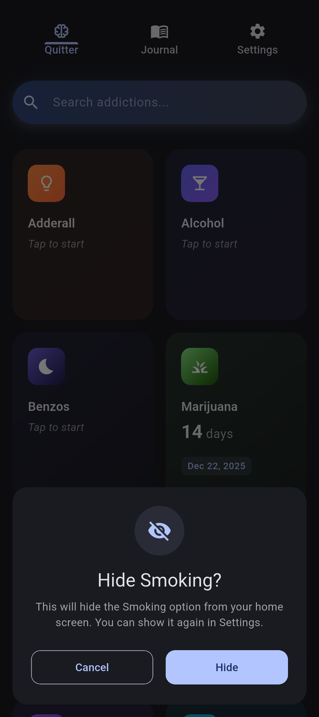 Quitter helps you quit smoking, vaping, alcohol, drugs, adult content, social media, and more—with research-backed health milestones that show exactly what's happening in your body as you recover.