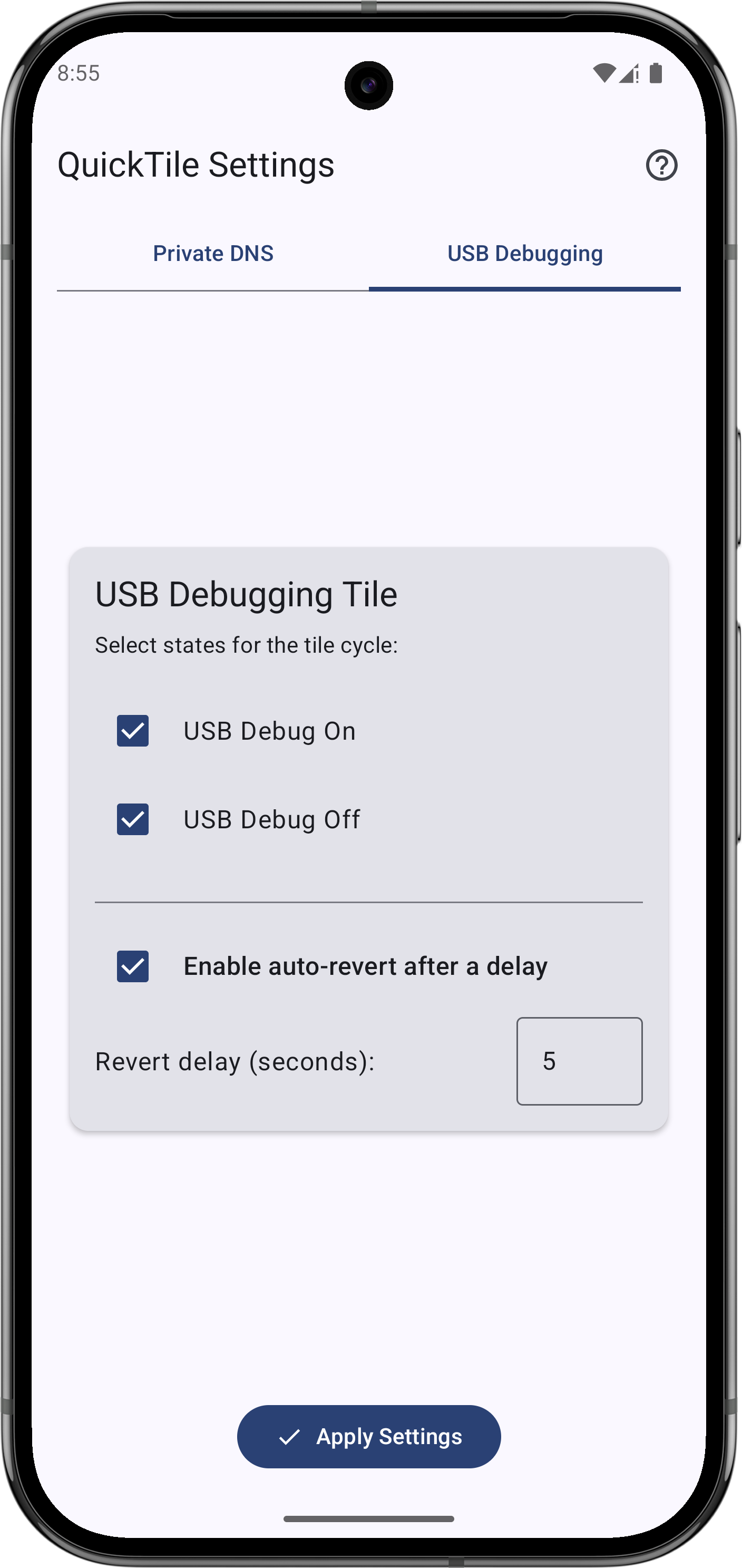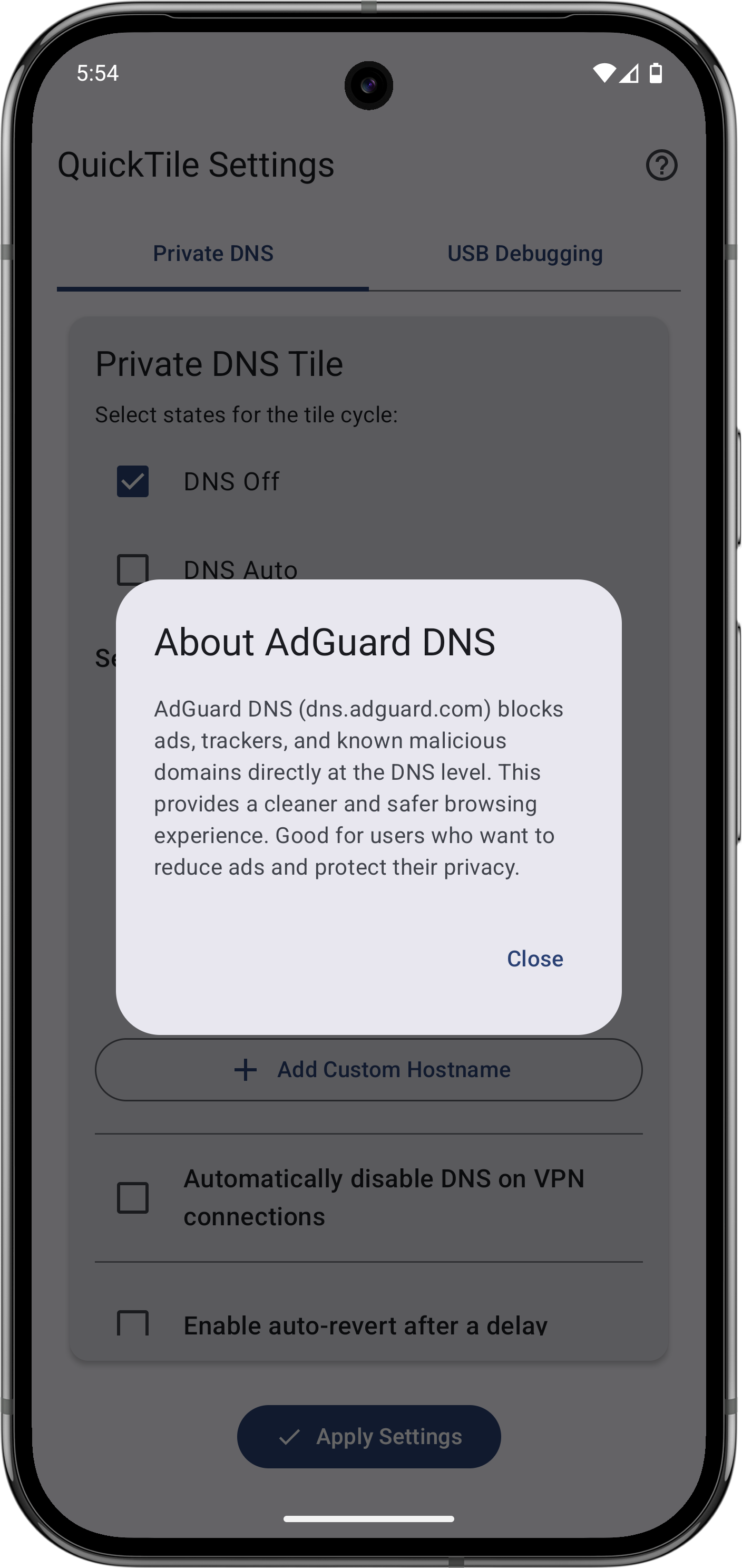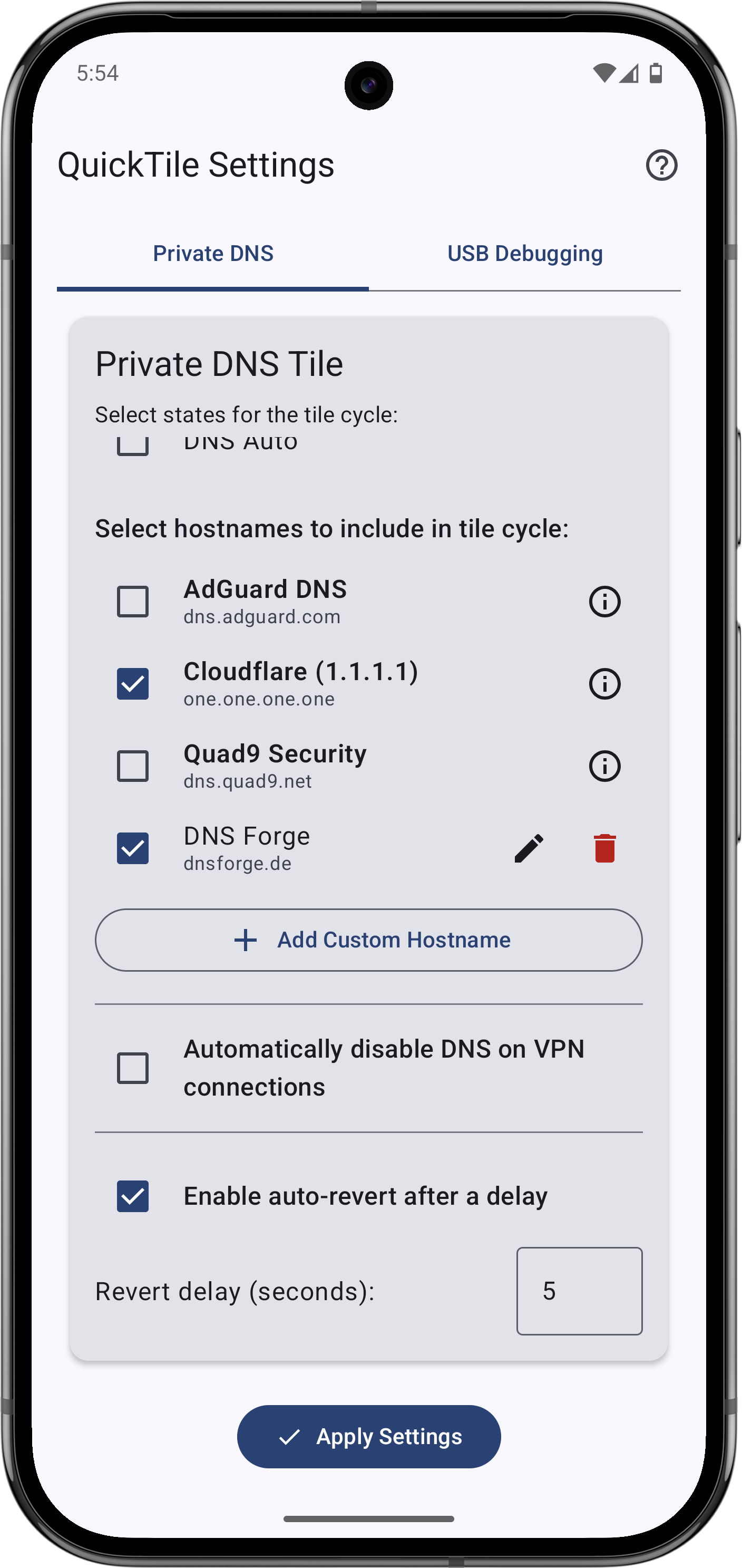 Manage Private DNS & USB Debugging via Quick Tile Settings tiles & Auto-revert.