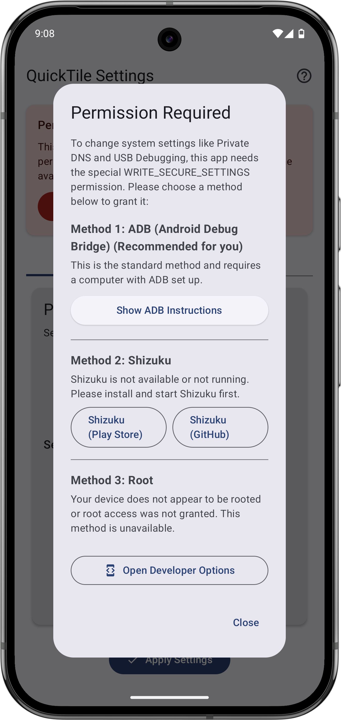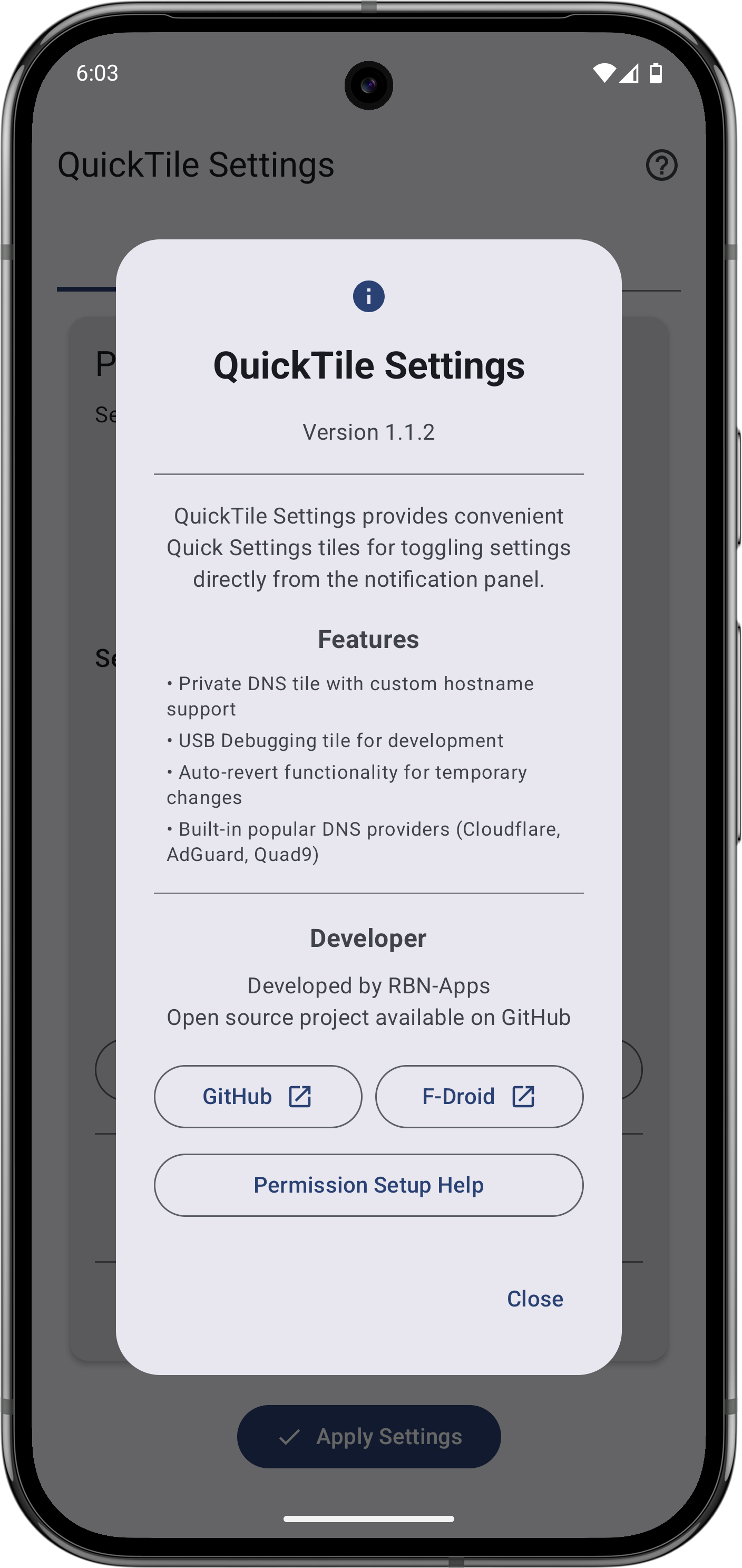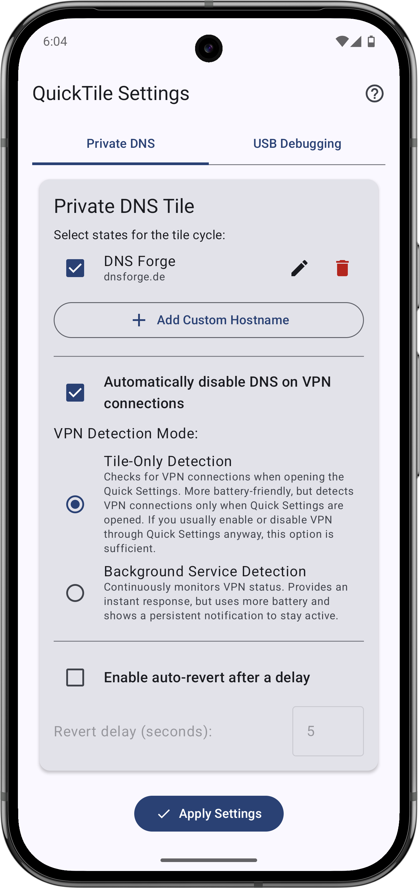 Manage Private DNS & USB Debugging via Quick Tile Settings tiles & Auto-revert.